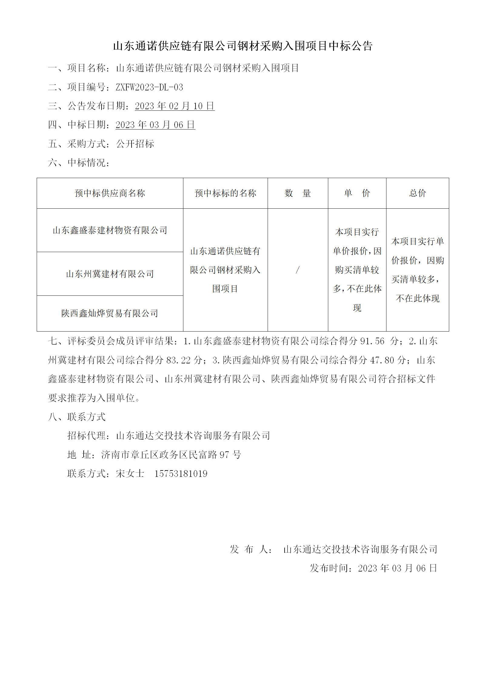 山东通诺供应链有限公司钢材采购入围项目中标公告