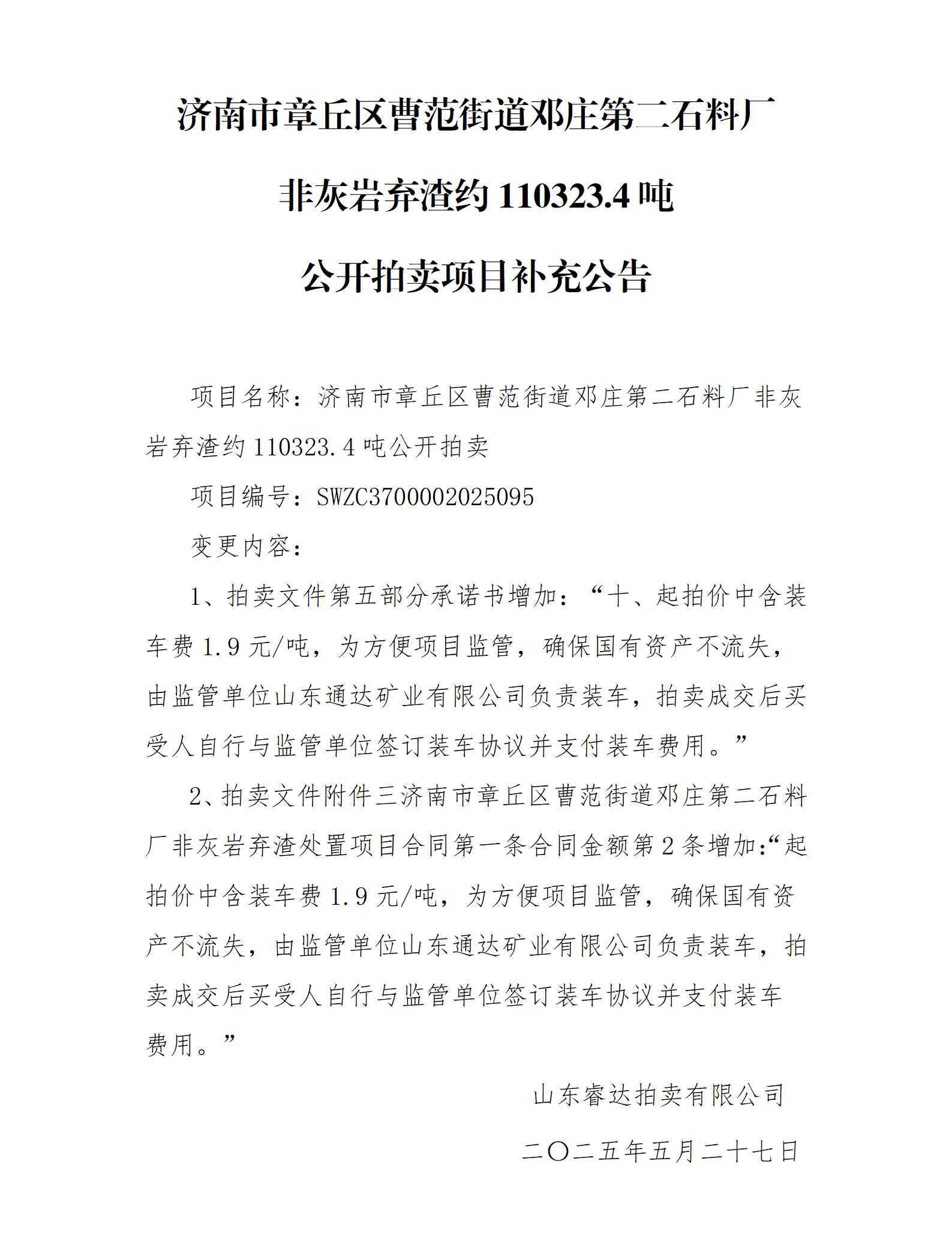 济南市章丘区曹范街道邓庄第二石料厂非灰岩弃渣约110323.4吨公开拍卖项目补充公告