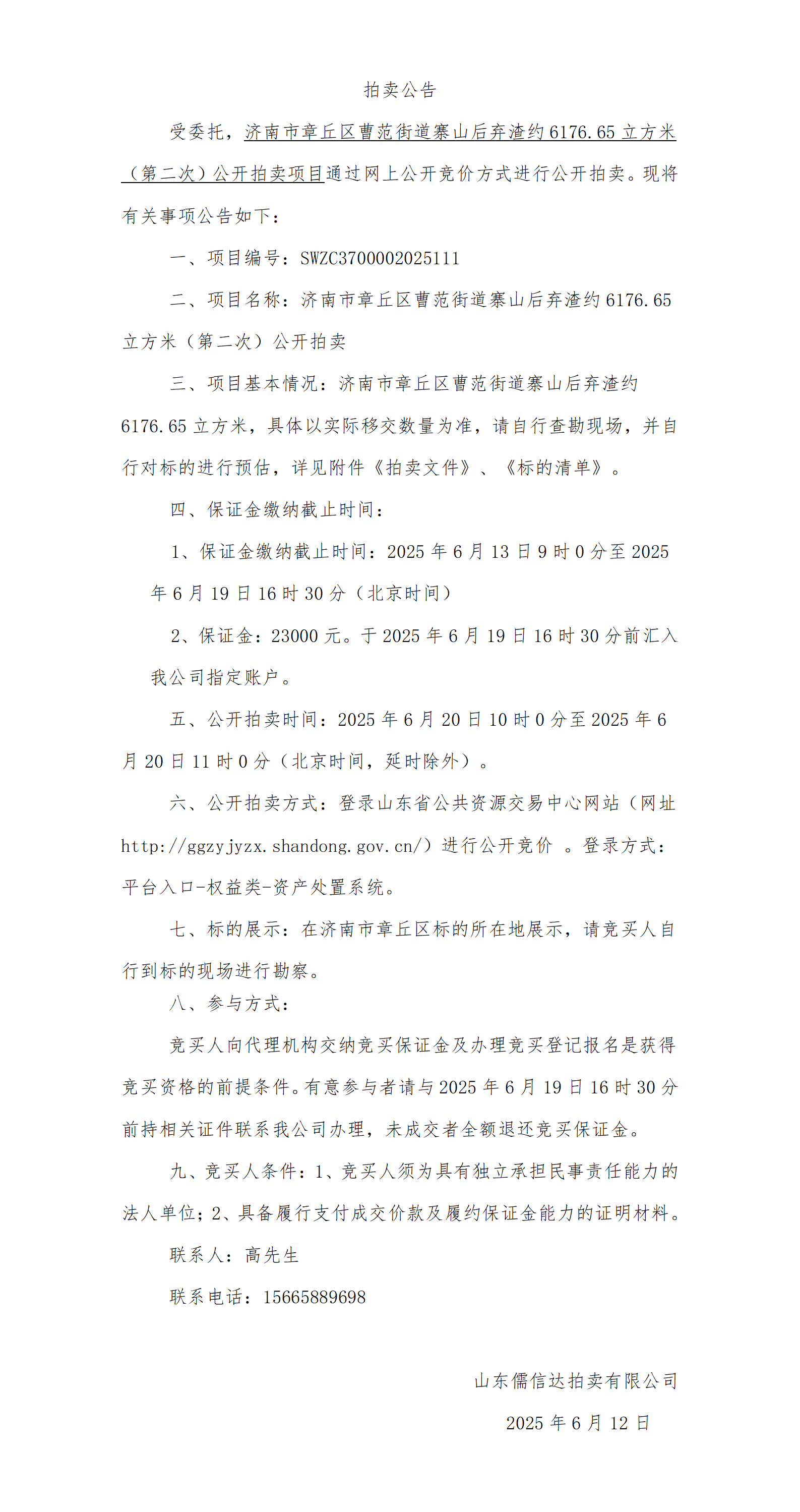 济南市章丘区曹范街道寨山后弃渣约6176.65立方米(第二次)公开拍卖项目拍卖公告