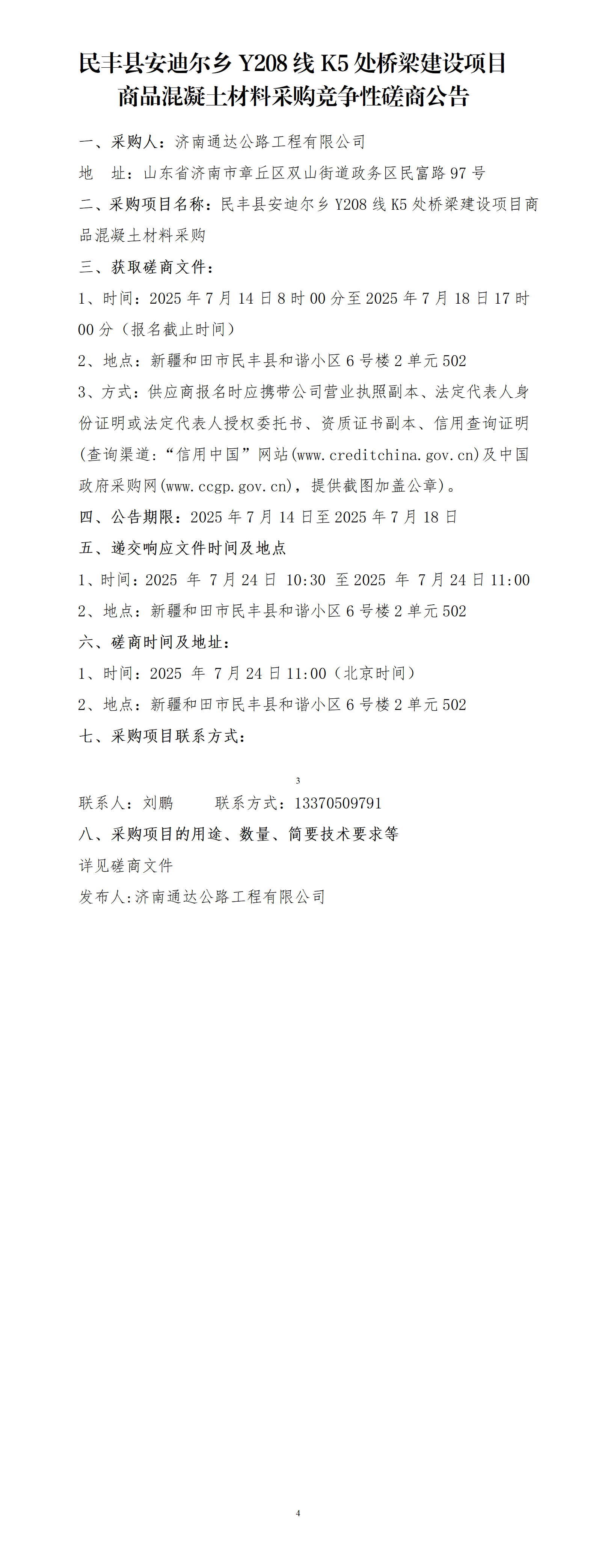 民丰县安迪尔乡Y208线K5处桥梁建设项目商品混凝土材料采购竞争性磋商公告