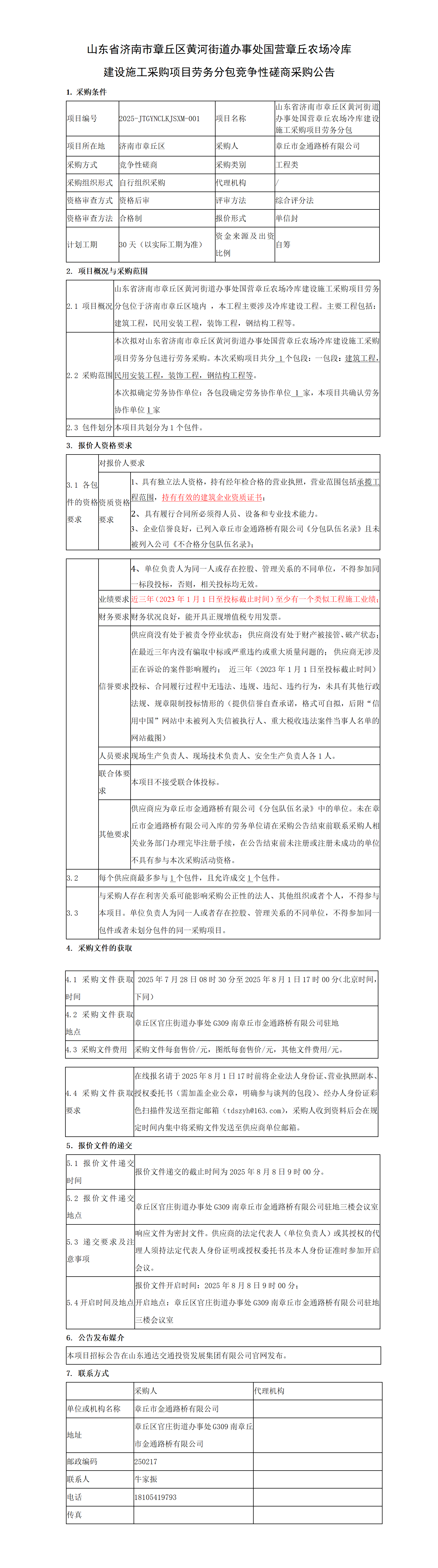 山东省济南市章丘区黄河街道办事处国营章丘农场冷库建设施工采购项目劳务分包竞争性磋商采购公告
