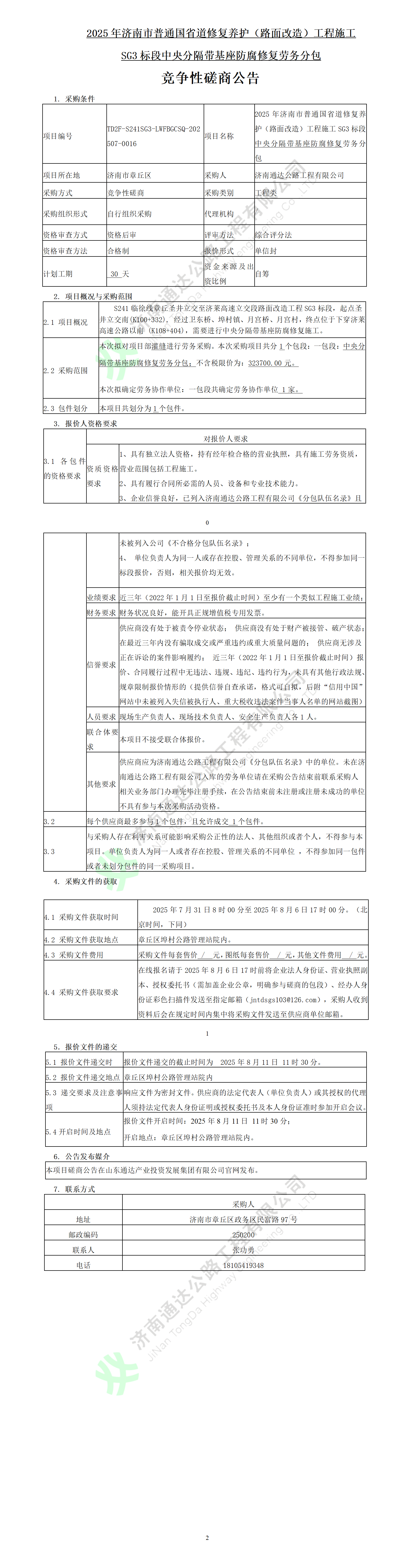 2025年济南市普通国省道修复养护(路面改造)工程施工 SG3 标段中央分隔带基座防腐修复劳务分包竞争性磋商公告