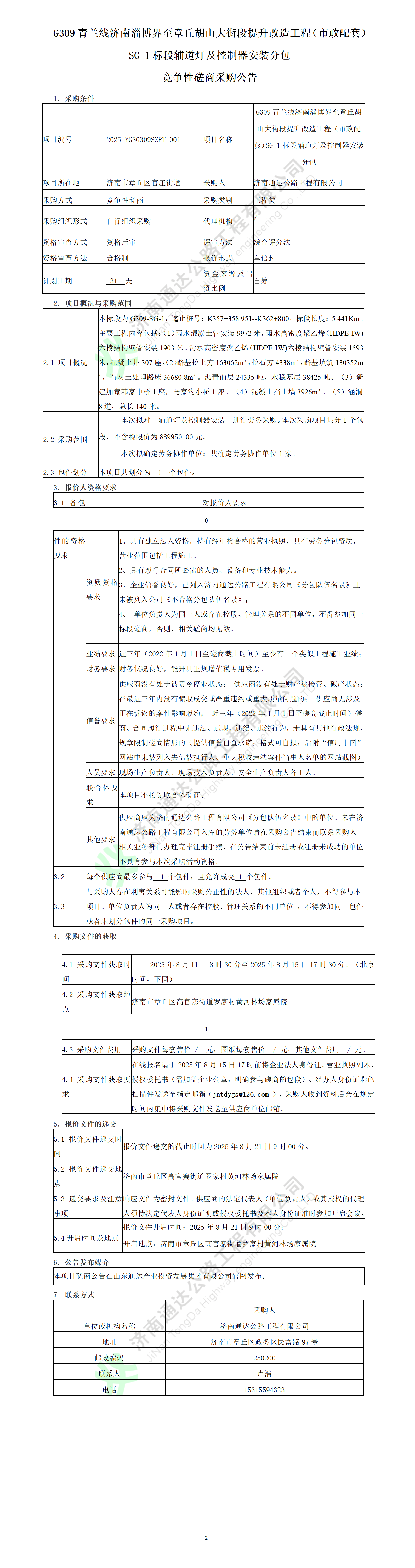 G309青兰线济南淄博界至章丘胡山大街段提升改造工程(市政配套)SG-1标段辅道灯及控制器安装分包竞争性磋商公告