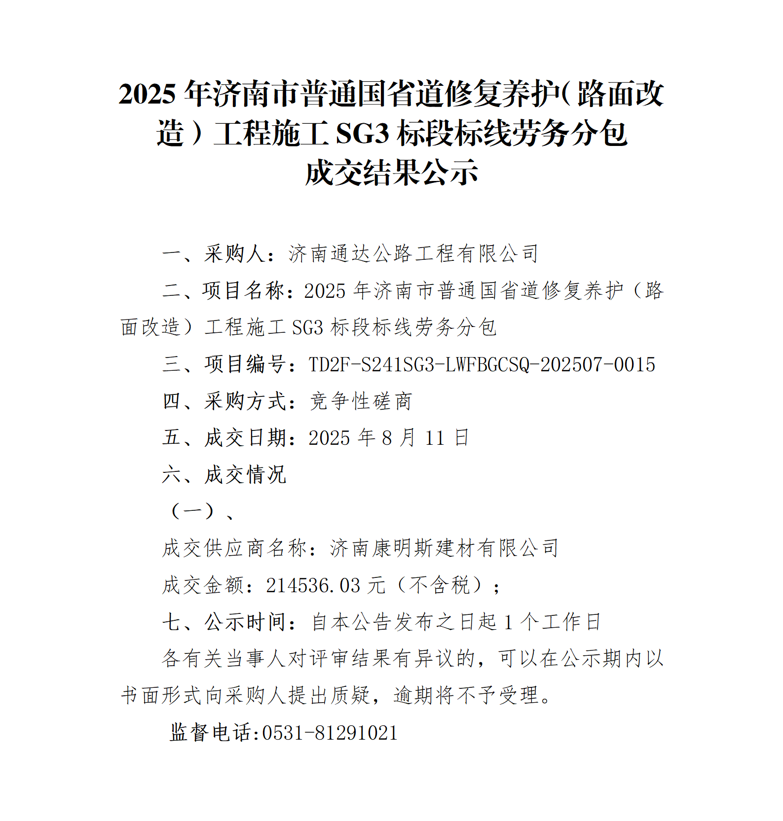 2025年济南市普通国省道修复养护(路面改造)工程施工SG3标段标线劳务分包成交结果公示