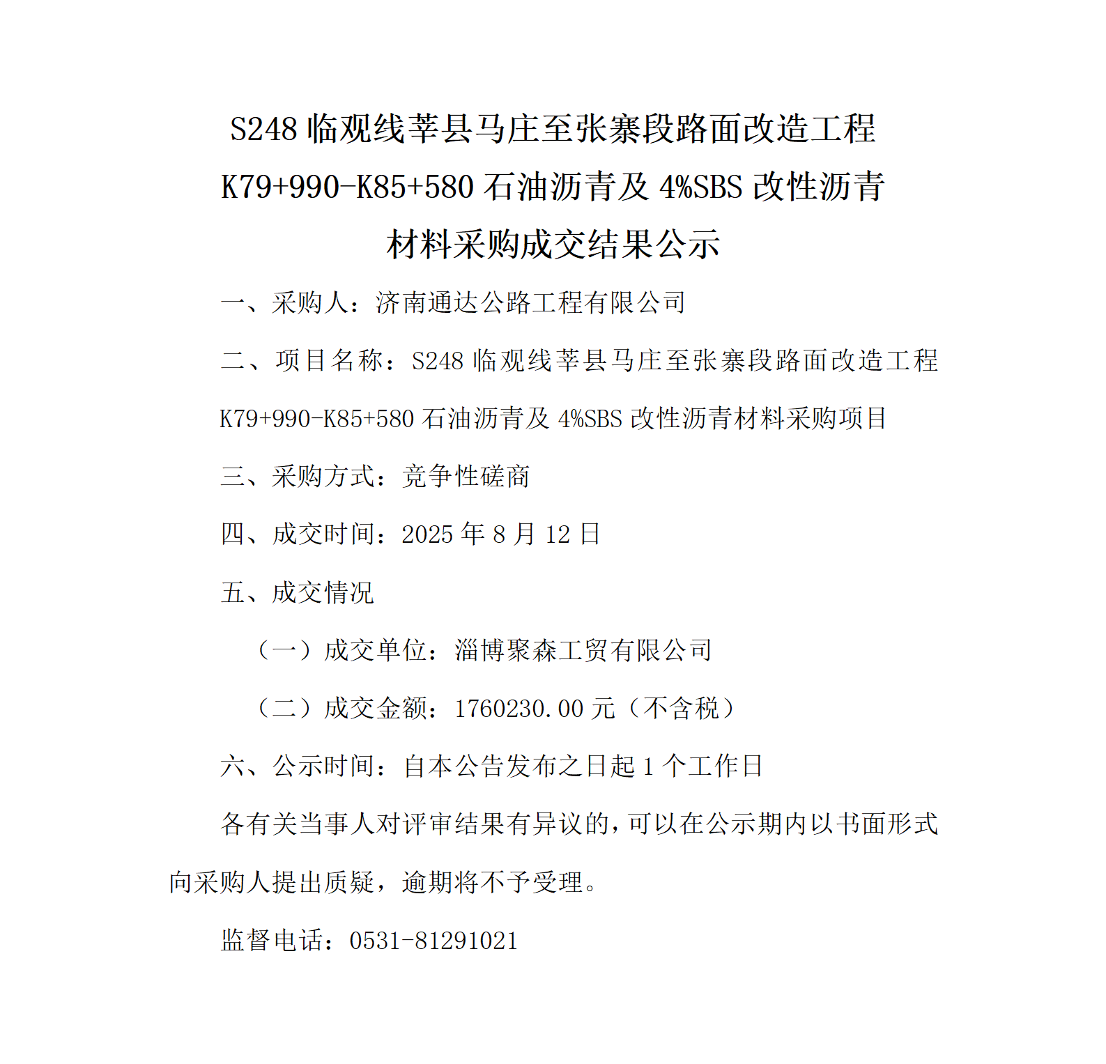 S248临观线莘县马庄至张寨段路面改造工程K79+990-K85+580石油沥青及4%SBS改性沥青材料采购成交结果公示