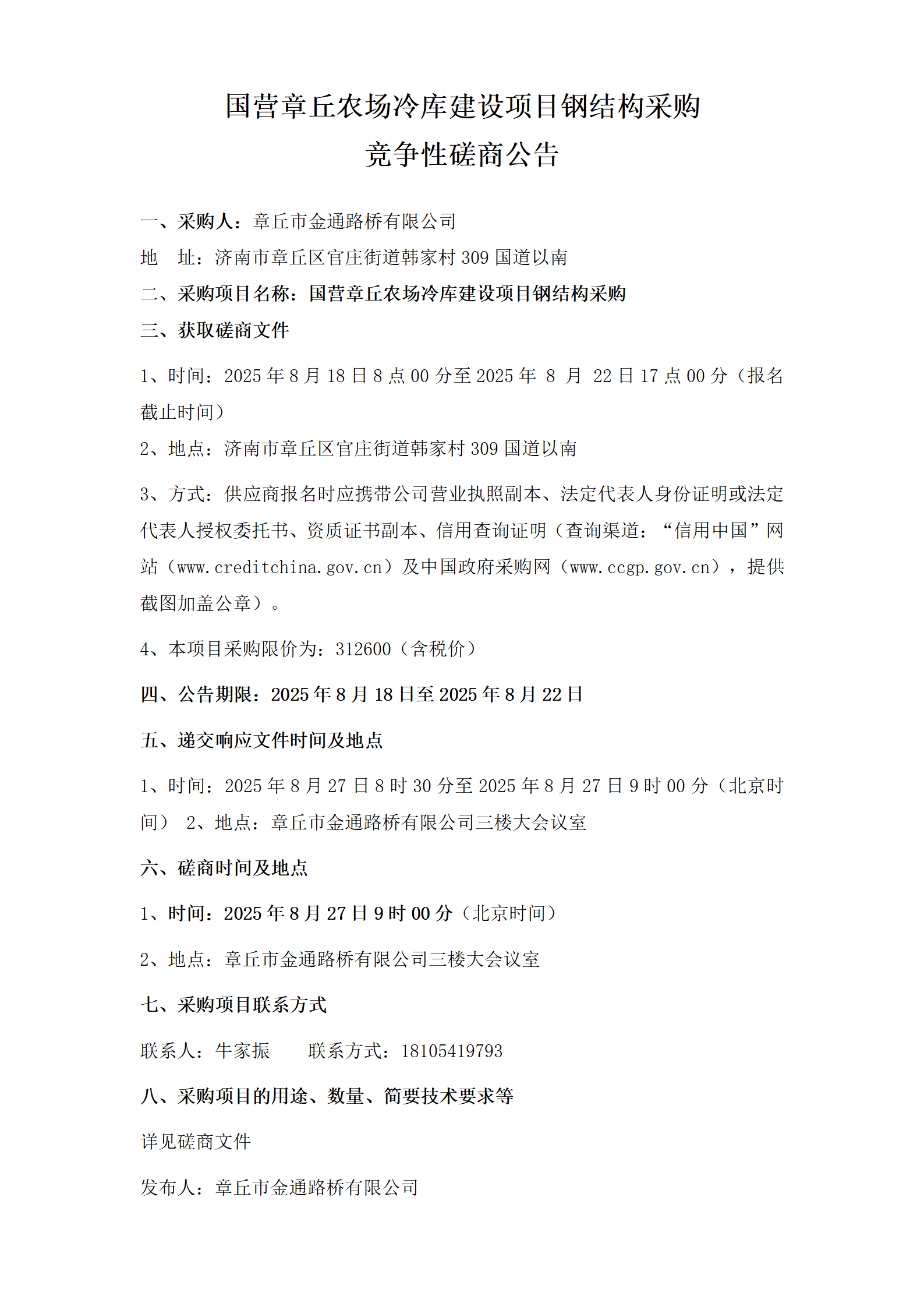 国营章丘农场冷库建设项目钢结构采购竞争性磋商公告