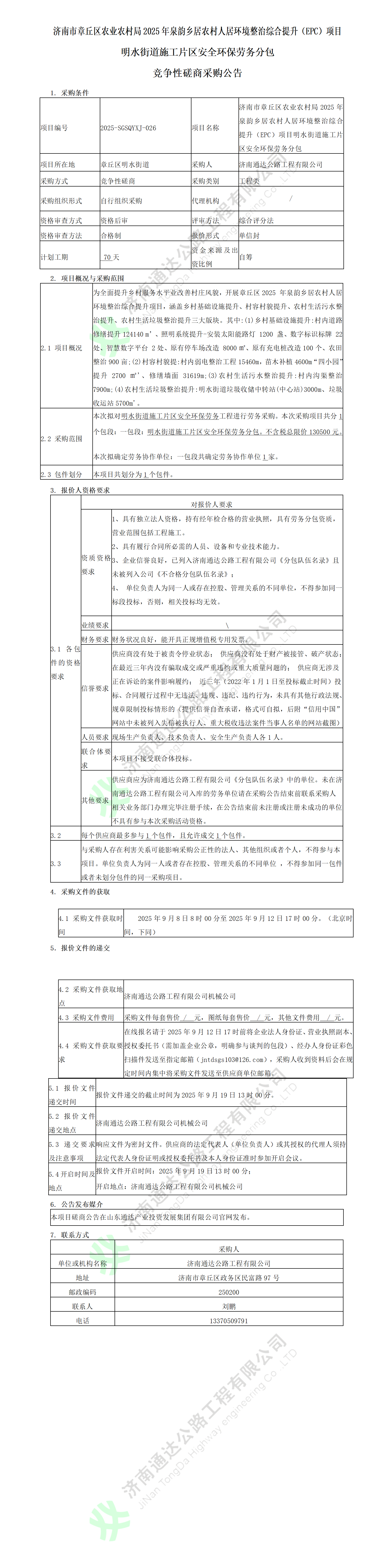 济南市章丘区农业农村局2025年泉韵乡居农村人居环境整治综合提升(EPC)项目明水街道施工片区安全环保劳务分包竞争性磋商采购公告