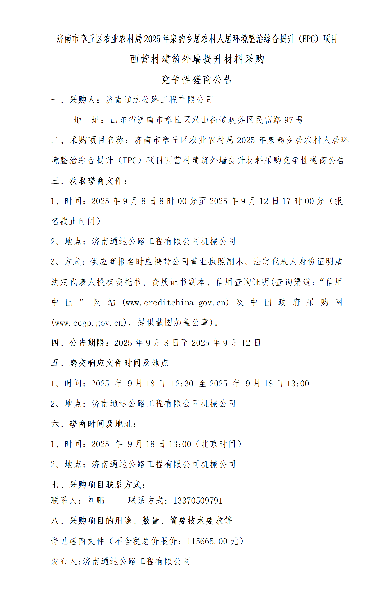 济南市章丘区农业农村局2025年泉韵乡居农村人居环境整治综合提升(EPC)项目西营村建筑外墙提升劳务分包竞争性磋商采购公告