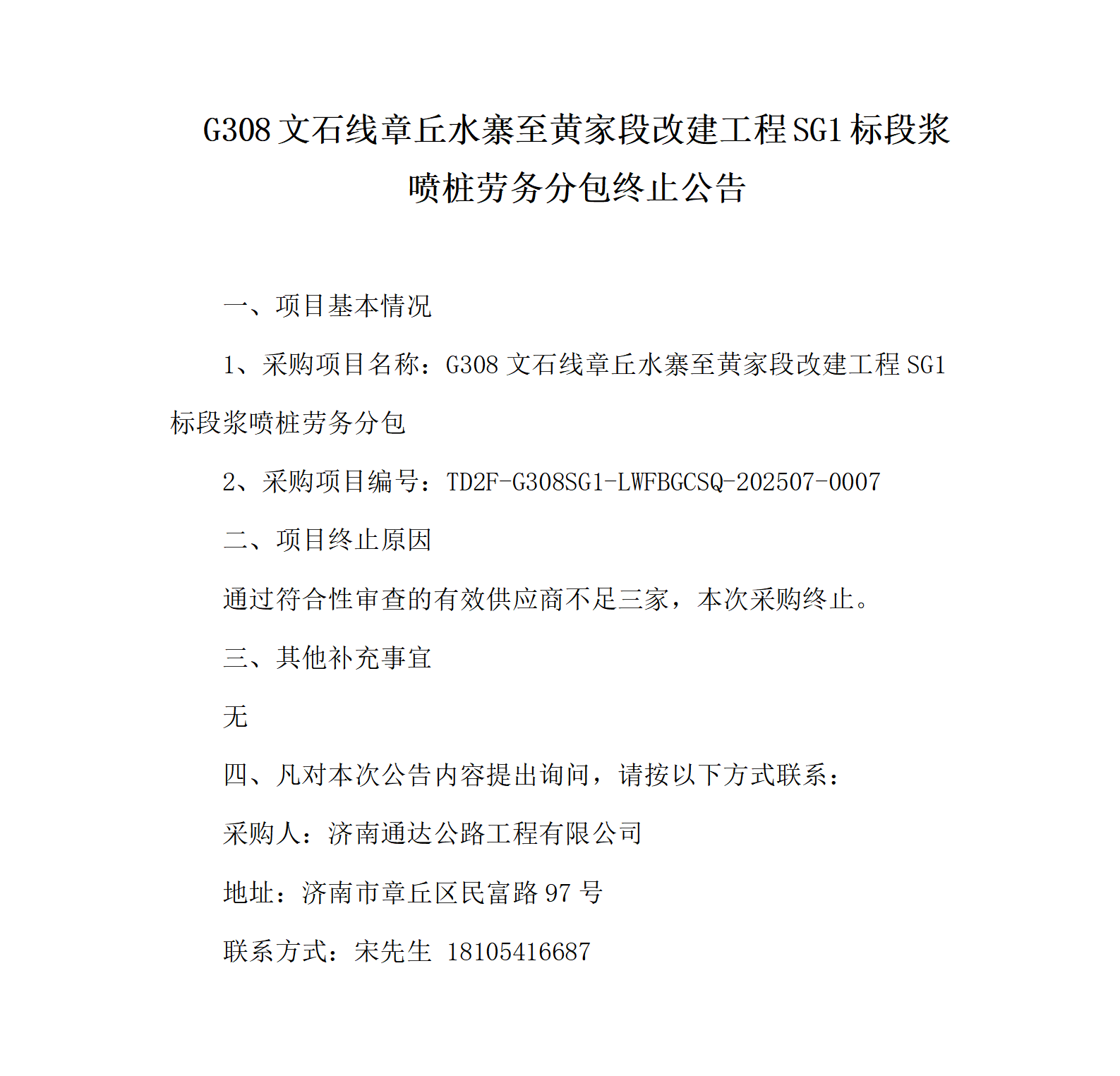 G308文石线章丘水寨至黄家段改建工程SG1标段浆喷桩劳务分包终止公告