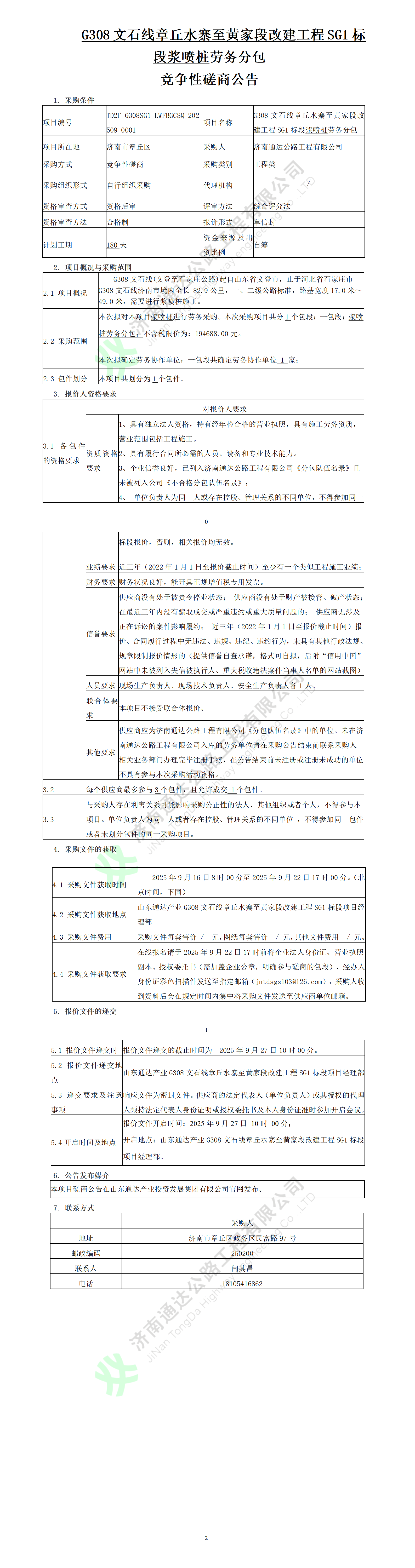 G308文石线章丘水寨至黄家段改建工程SG1标段浆喷桩劳务分包竞争性磋商公告