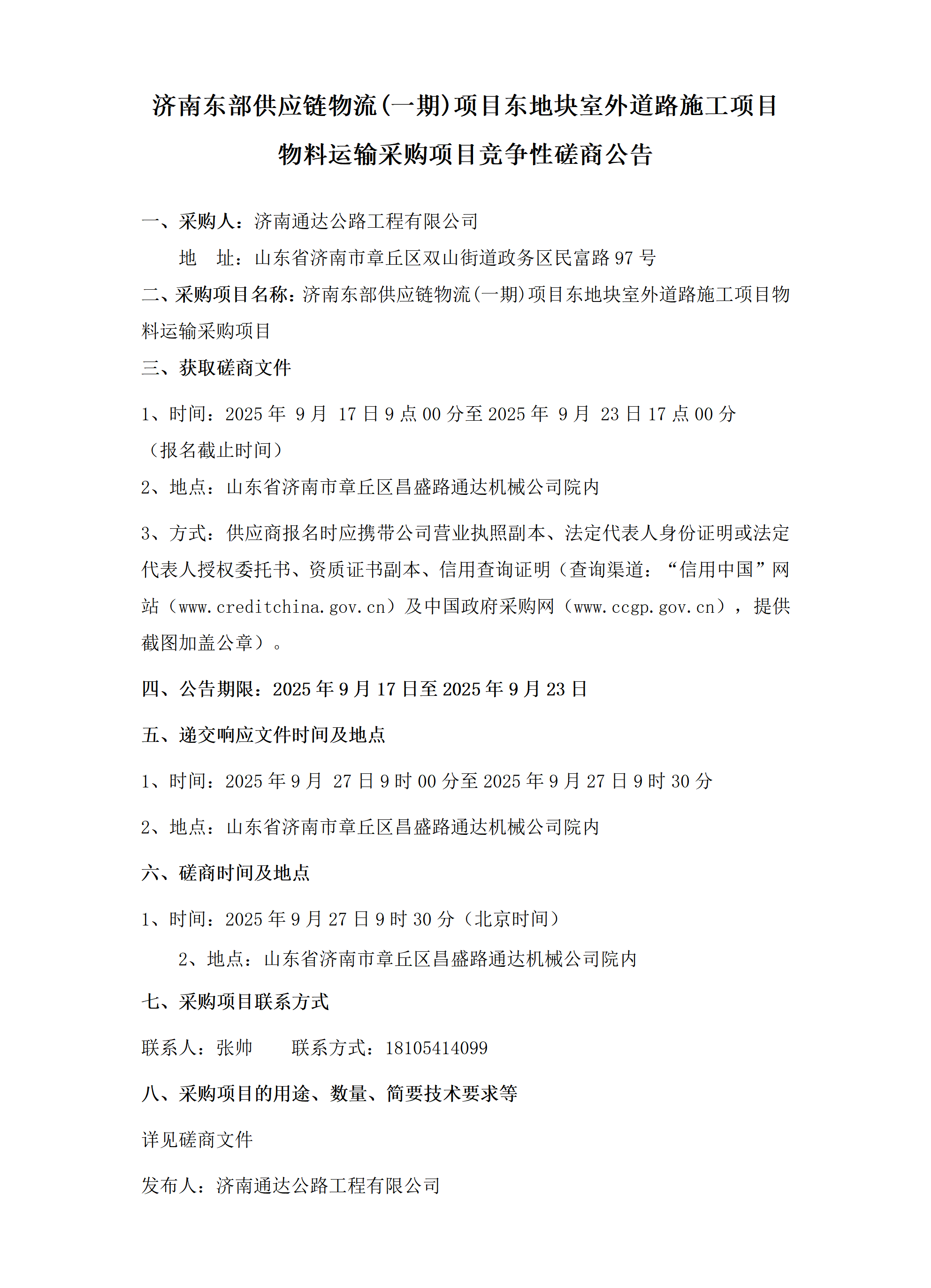 济南东部供应链物流(一期)项目东地块室外道路施工项目物料运输采购项目竞争性磋商公告