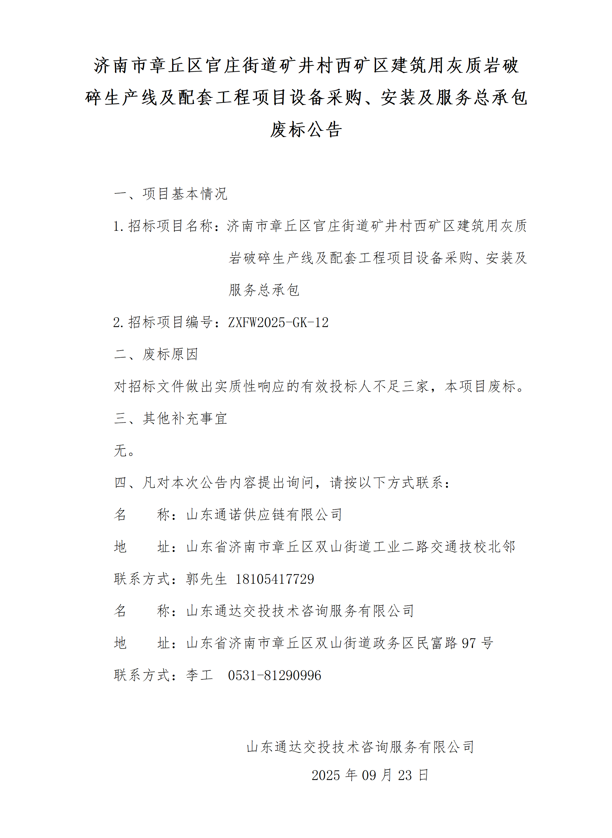 济南市章丘区官庄街道矿井村西矿区建筑用灰质岩破碎生产线及配套工程项目的设备采购、安装及服务总承包废标公告