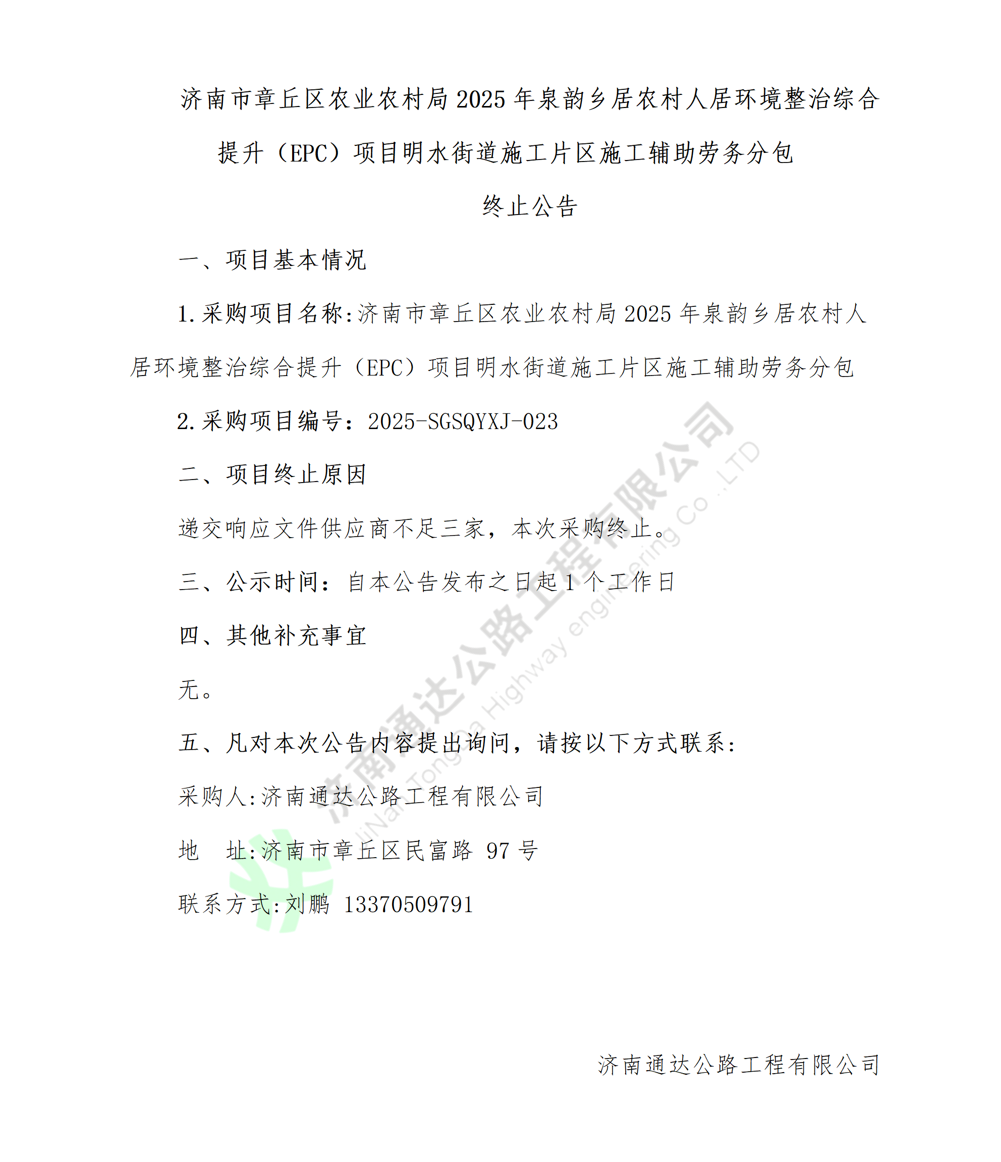 济南市章丘区农业农村局2025年泉韵乡居农村人居环境整治综合提升(EPC)项目明水街道施工片区施工辅助劳务分包终止公告