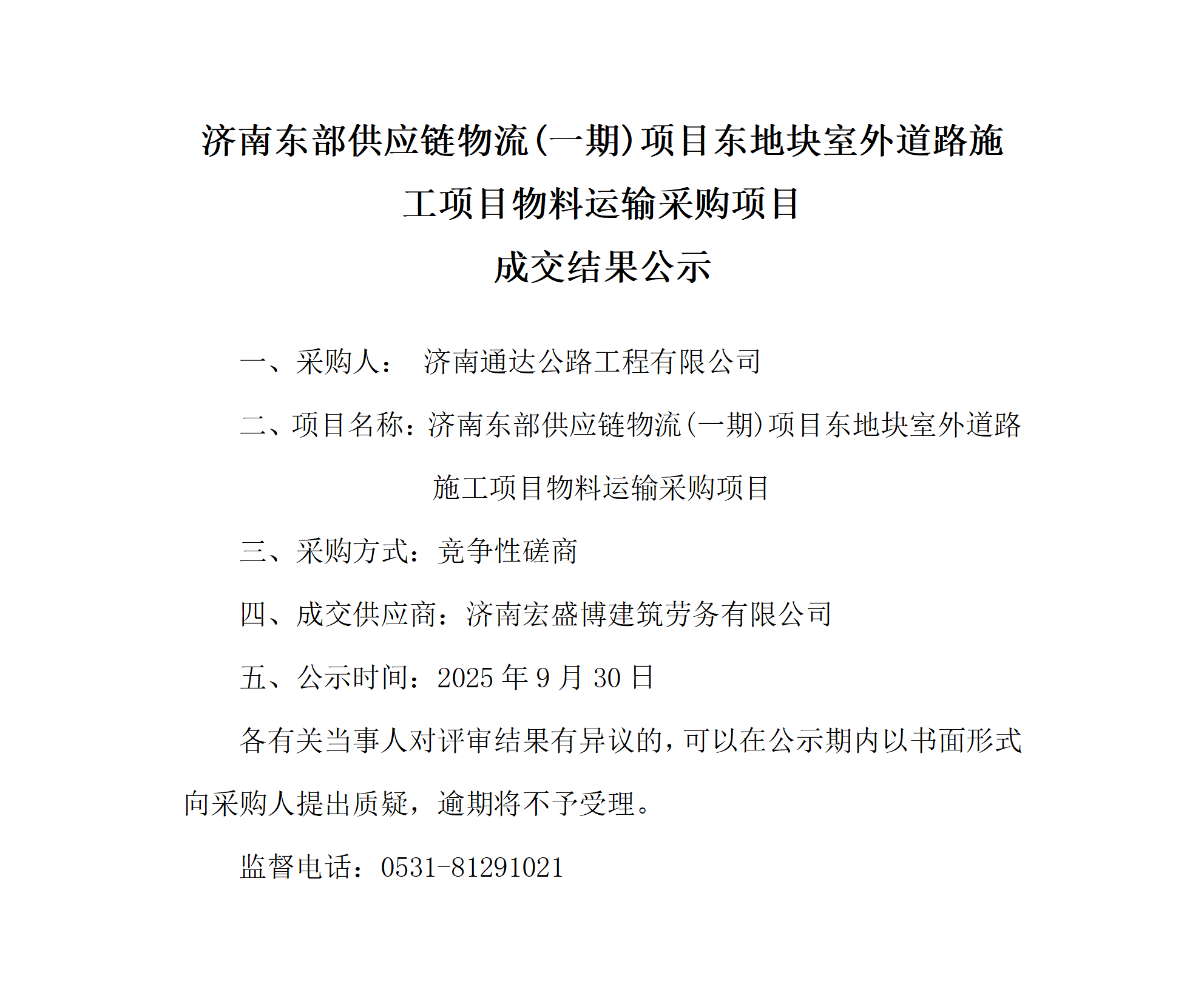 济南东部供应链物流(一期)项目东地块室外道路施工项目物料运输采购项目成交结果公示
