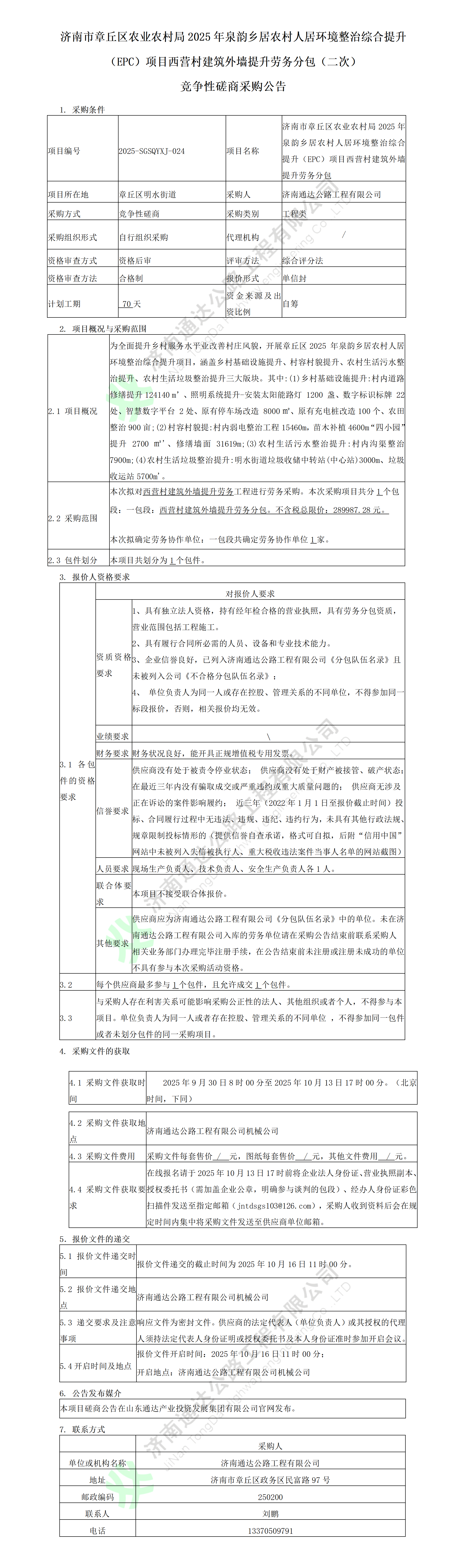 济南市章丘区农业农村局2025年泉韵乡居农村人居环境整治综合提升(EPC)项目西营村建筑外墙提升劳务分包(二次)竞争性磋商公告