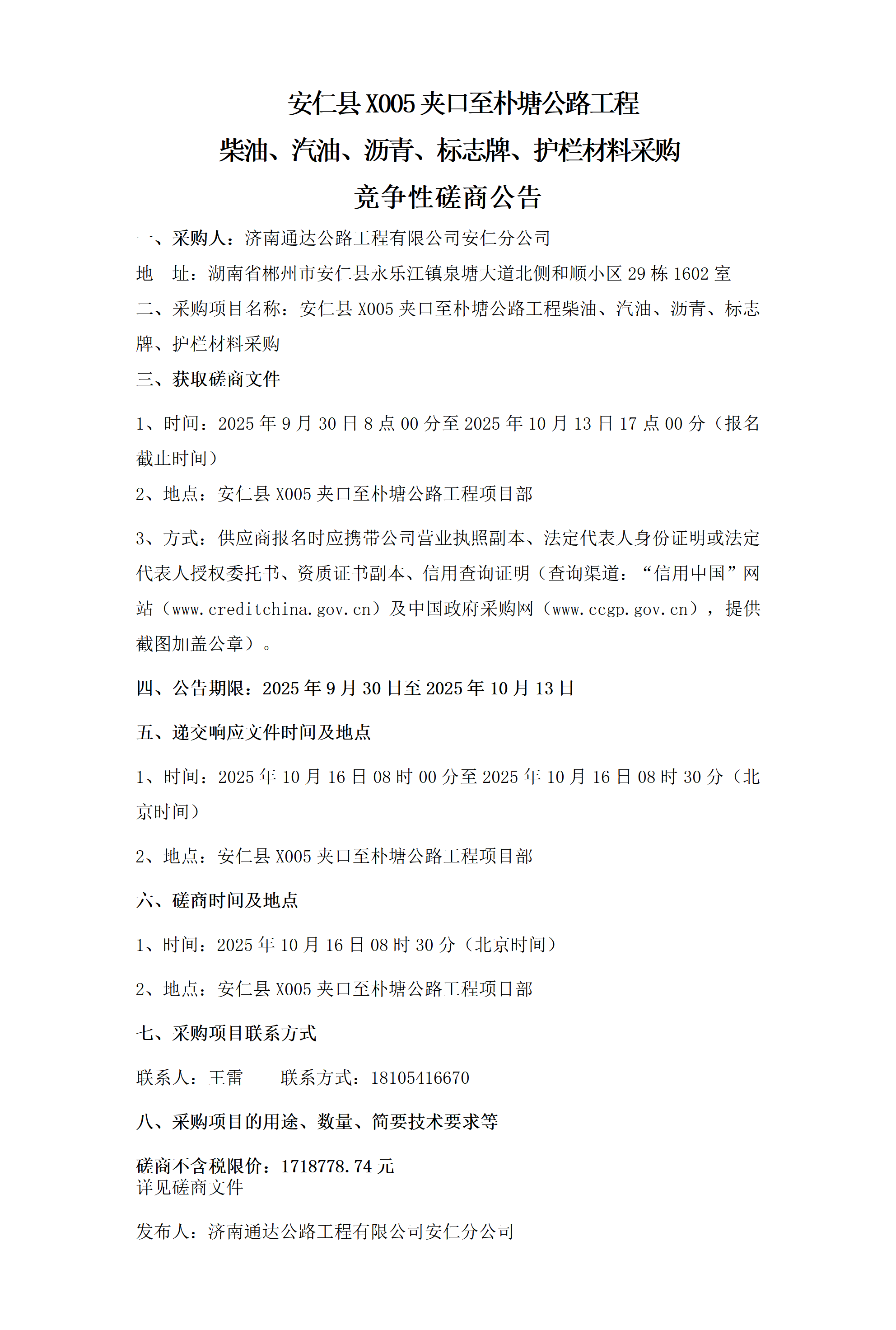 安仁县X005夹口至朴塘公路工程 柴油、汽油、沥青、标志牌、护栏材料采购竞争性磋商公告