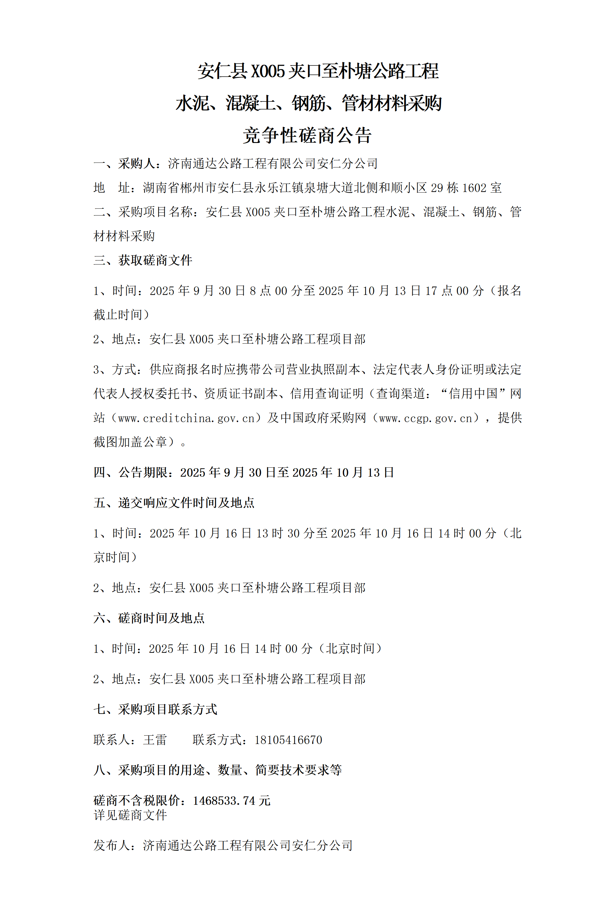 安仁县X005夹口至朴塘公路工程 水泥、混凝土、钢筋、管材材料采购 竞争性磋商公告