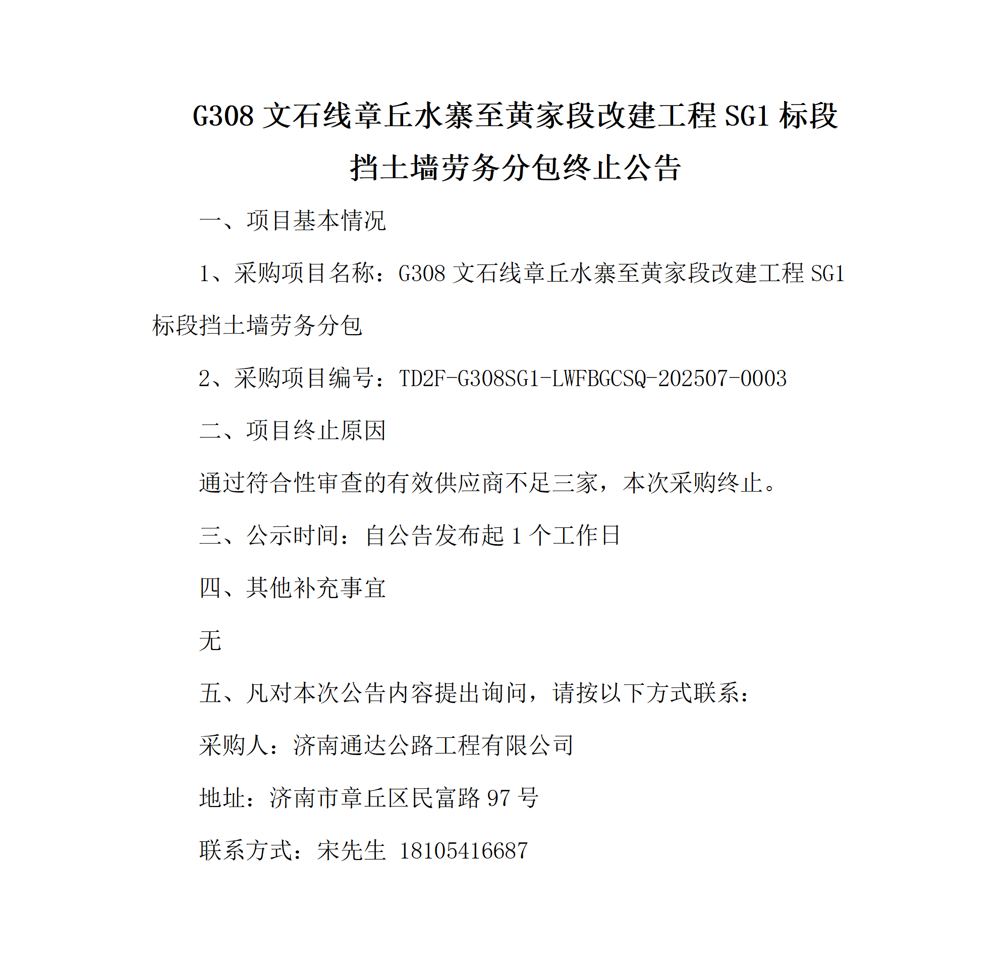 G308文石线章丘水寨至黄家段改建工程SG1标段挡土墙劳务分包终止公告