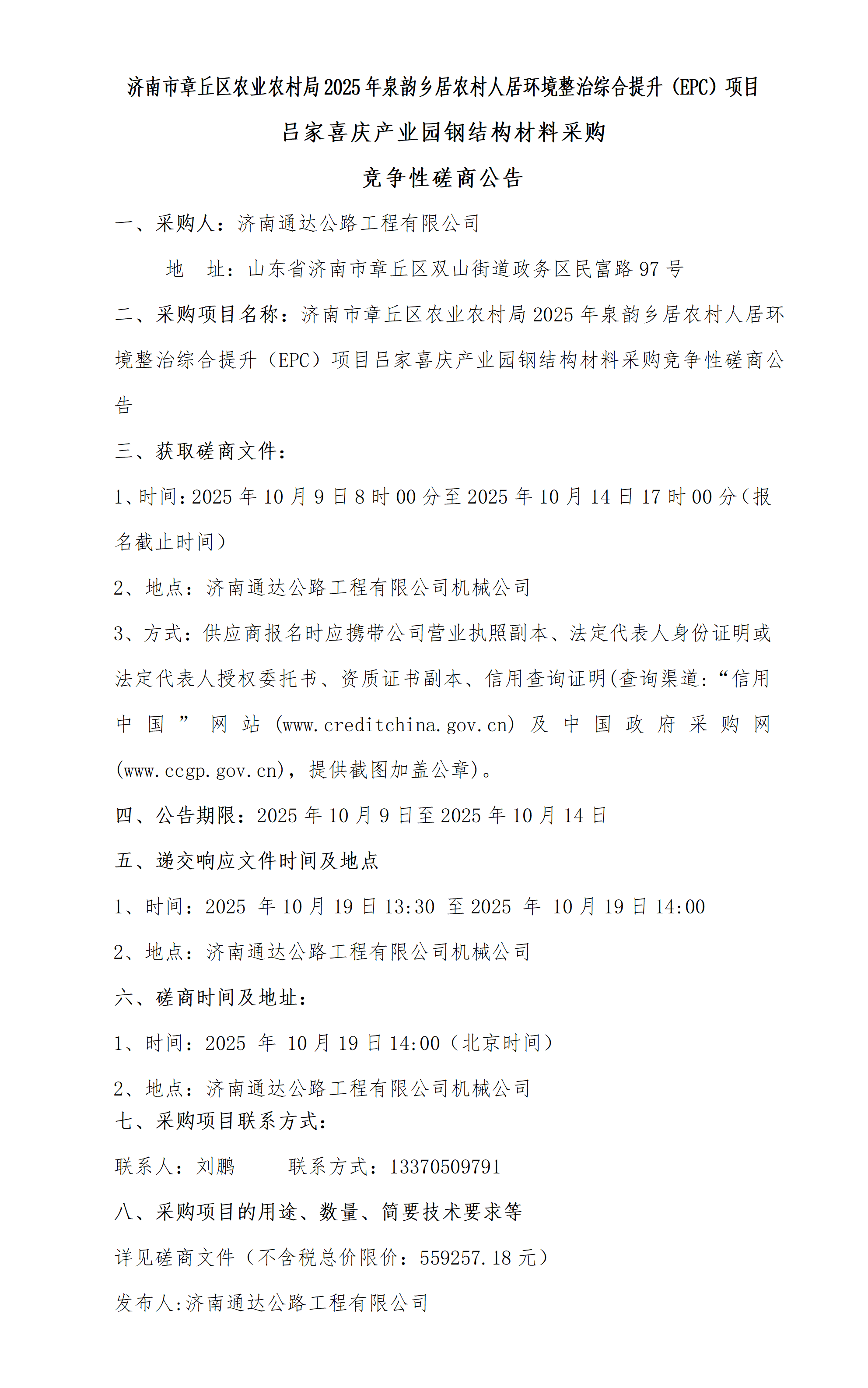 济南市章丘区农业农村局2025年泉韵乡居农村人居环境整治综合提升(EPC)项目吕家喜庆产业园钢结构材料采购竞争性磋商公告