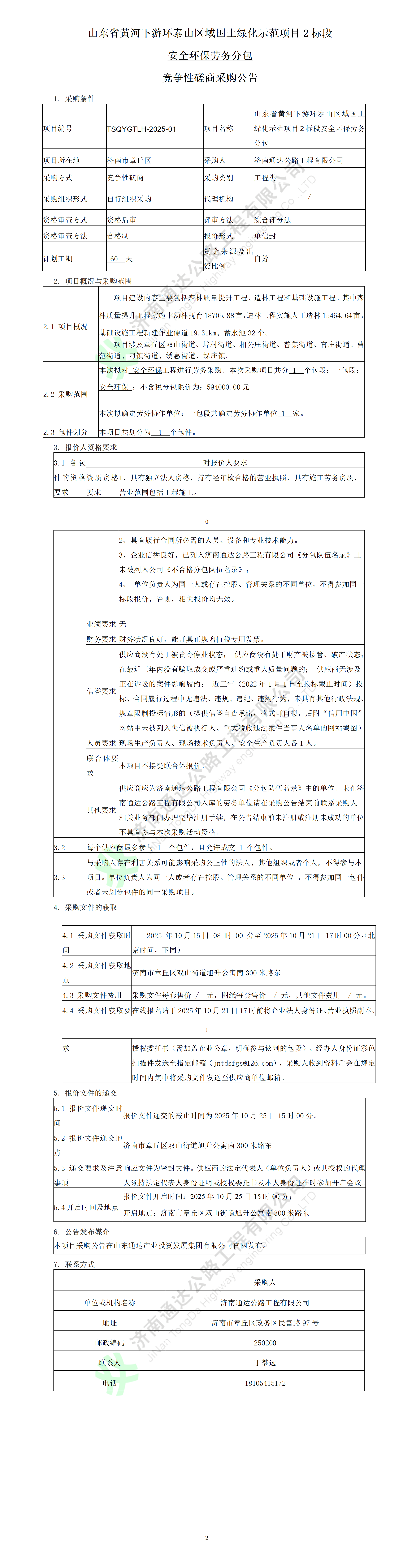 山东省黄河下游环泰山区域国土绿化示范项目2标段安全环保劳务分包竞争性磋商采购公告