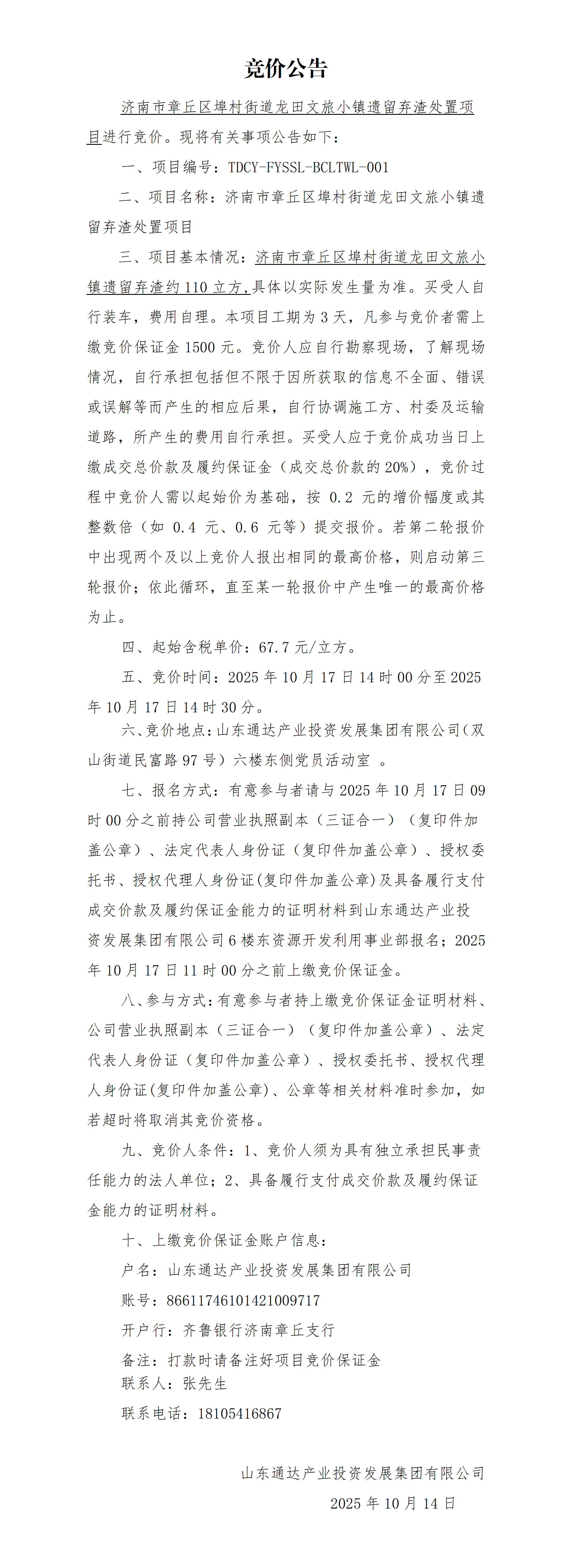 济南市章丘区埠村街道龙田文旅小镇遗留弃渣处置项目竞价公告