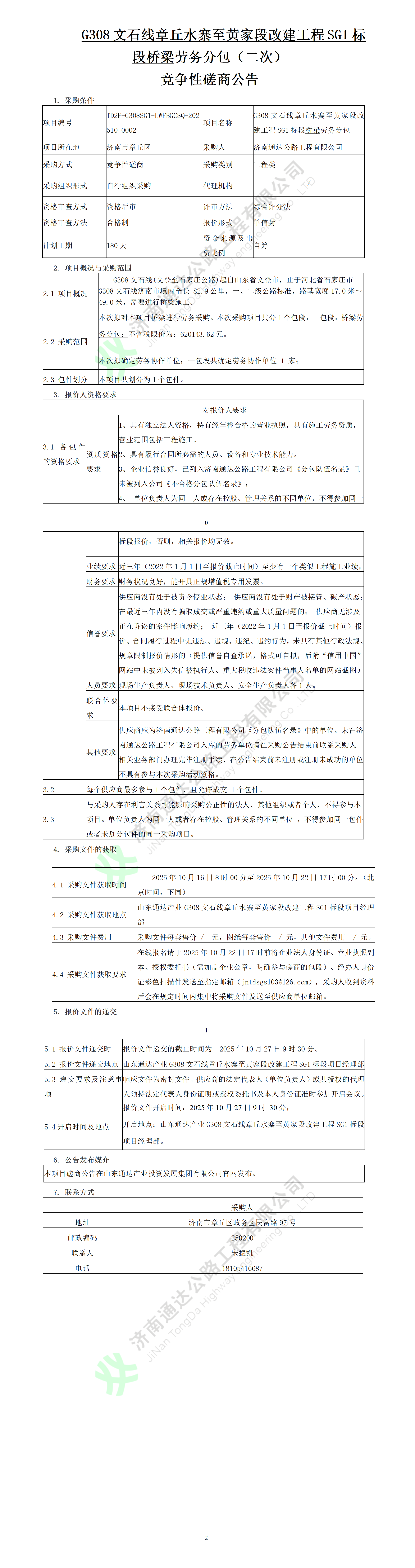 G308文石线章丘水寨至黄家段改建工程SG1标段桥梁劳务分包(二次)竞争性磋商公告