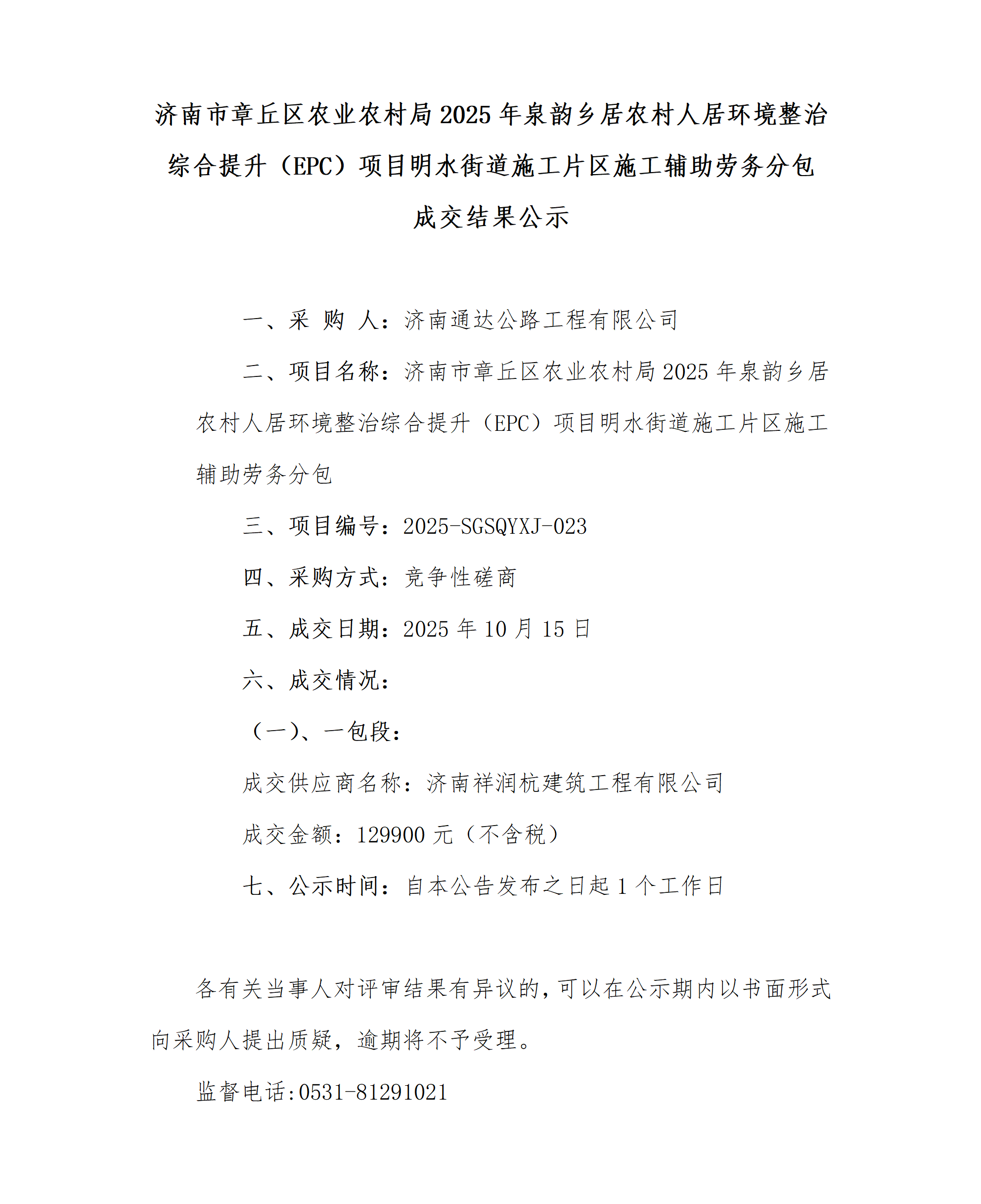 济南市章丘区农业农村局2025年泉韵乡居农村人居环境整治综合提升(EPC)项目明水街道施工片区施工辅助劳务分包成交结果公示