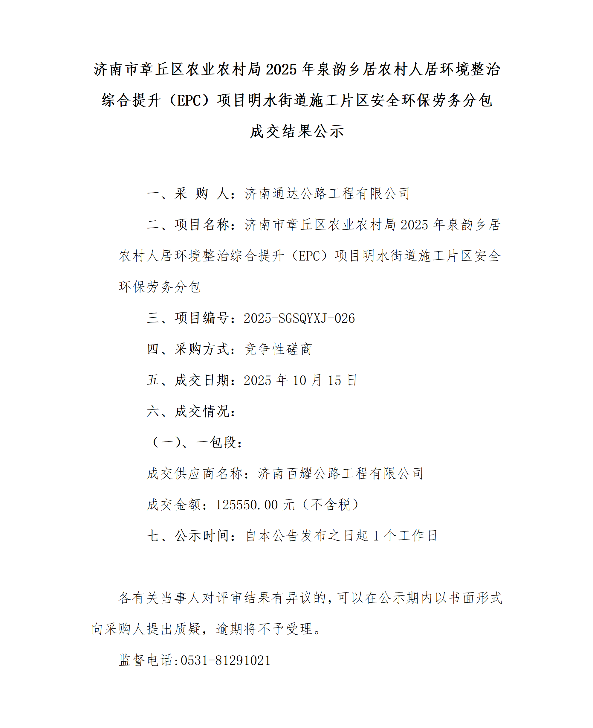 济南市章丘区农业农村局2025年泉韵乡居农村人居环境整治综合提升(EPC)项目明水街道施工片区安全环保劳务分包成交结果公示