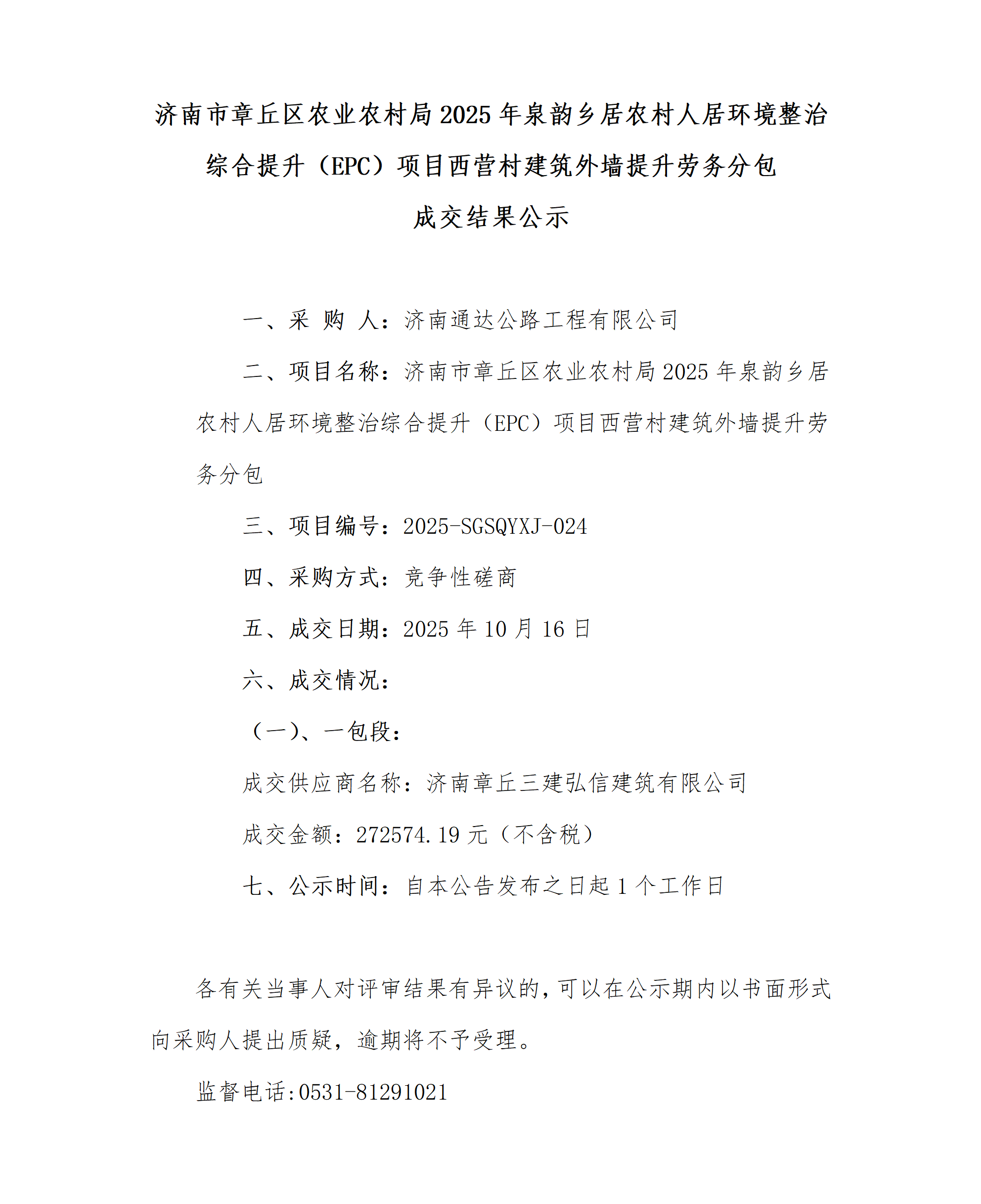 济南市章丘区农业农村局2025年泉韵乡居农村人居环境整治综合提升(EPC)项目西营村建筑外墙提升劳务分包成交结果公示