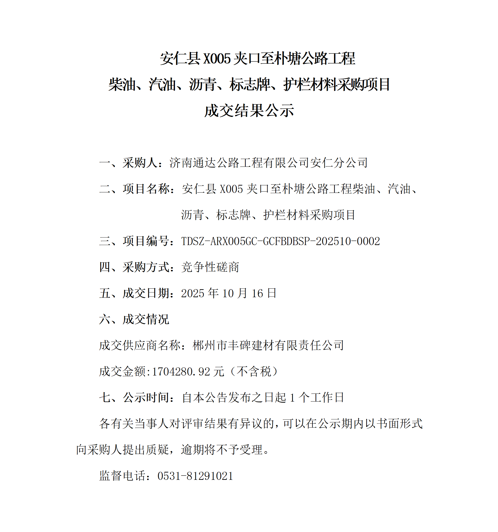 安仁县X005夹口至朴塘公路工程柴油、汽油、沥青、标志牌、护栏材料采购项目成交结果公示