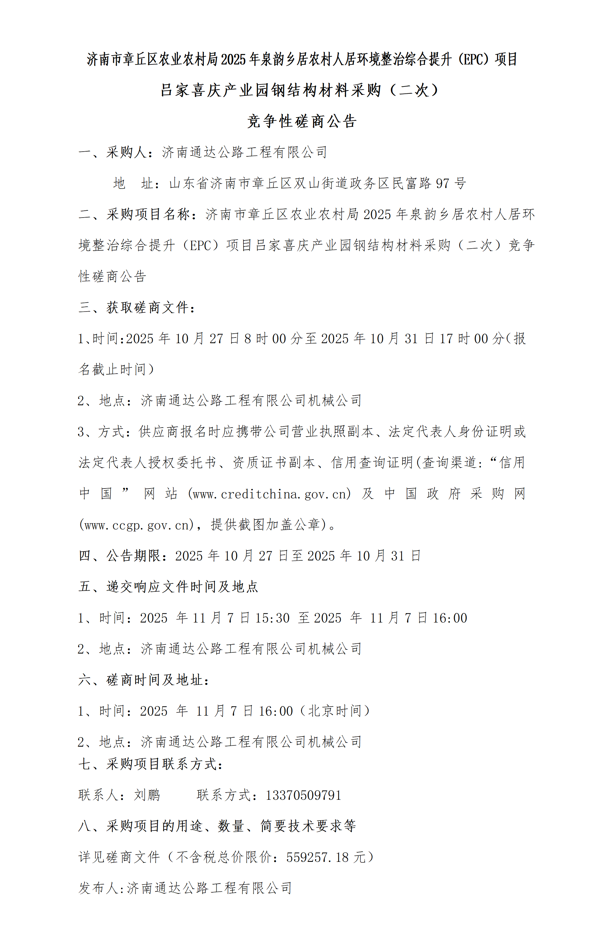 济南市章丘区农业农村局2025年泉韵乡居农村人居环境整治综合提升(EPC)项目吕家喜庆产业园钢结构材料采购(二次)竞争性磋商公告