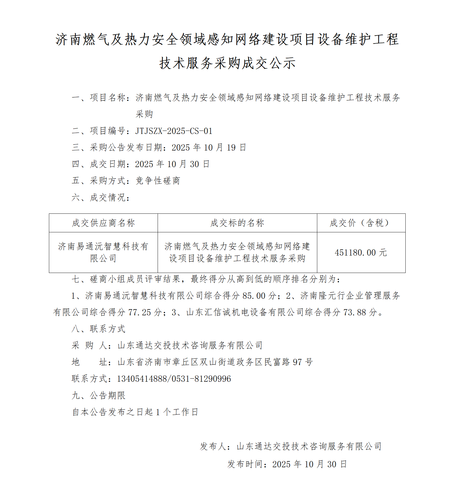 济南燃气及热力安全领域感知网络建设项目设备维护工程技术服务采购成交公示