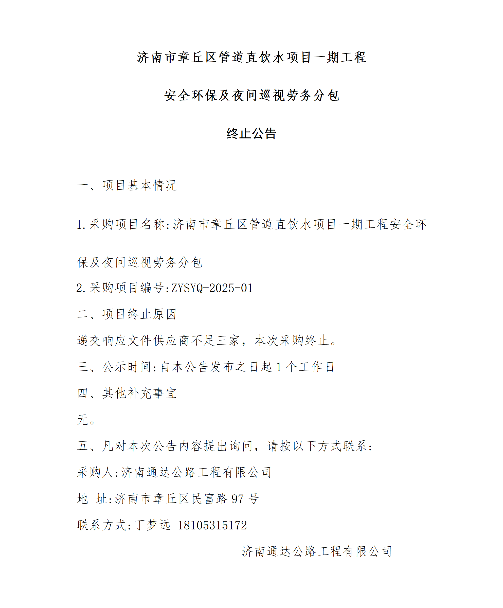 济南市章丘区管道直饮水项目一期工程安全环保及夜间巡视劳务分包终止公告