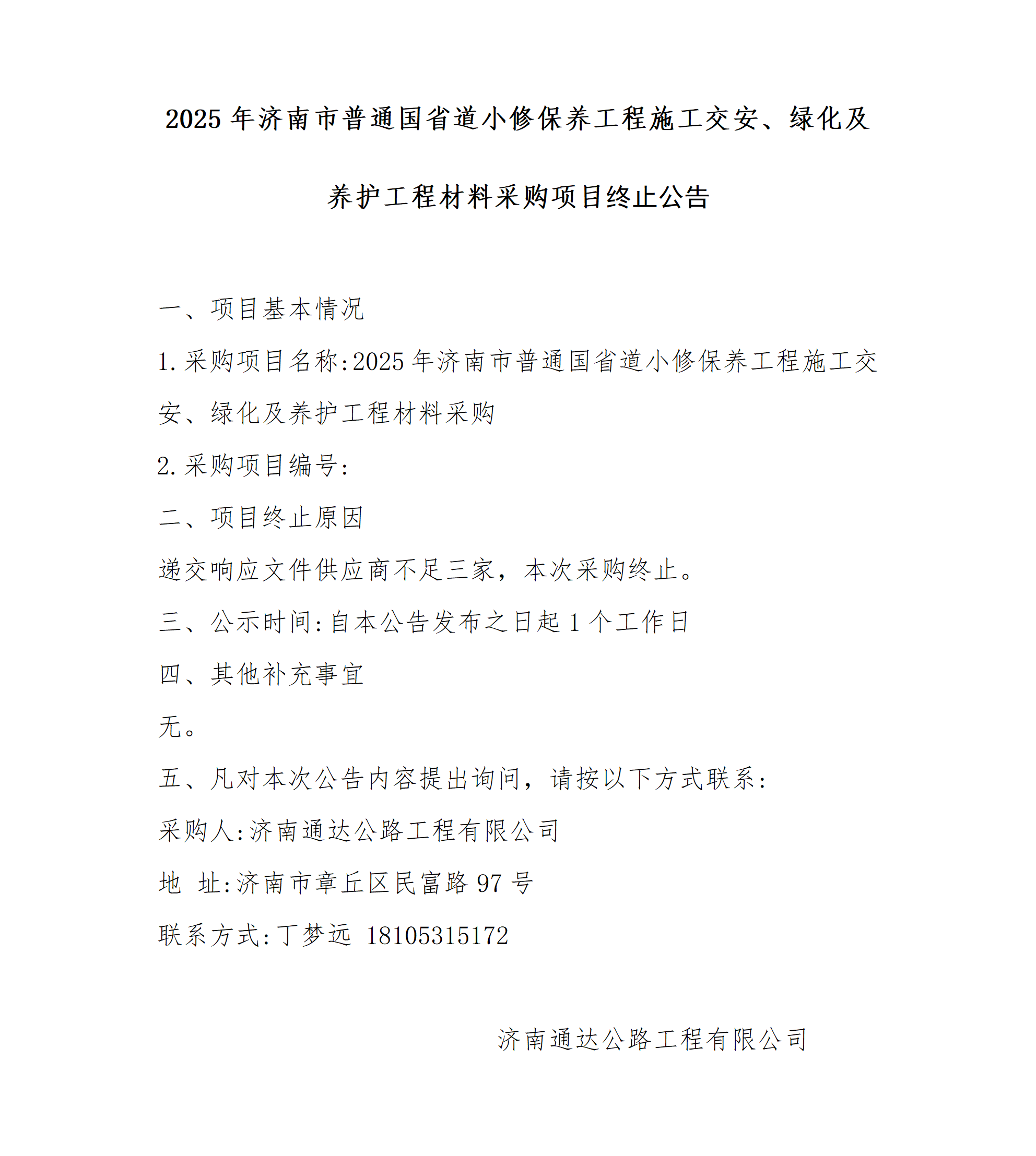 2025年济南市普通国省道小修保养工程施工交安、绿化及养护工程材料采购项目终止公告