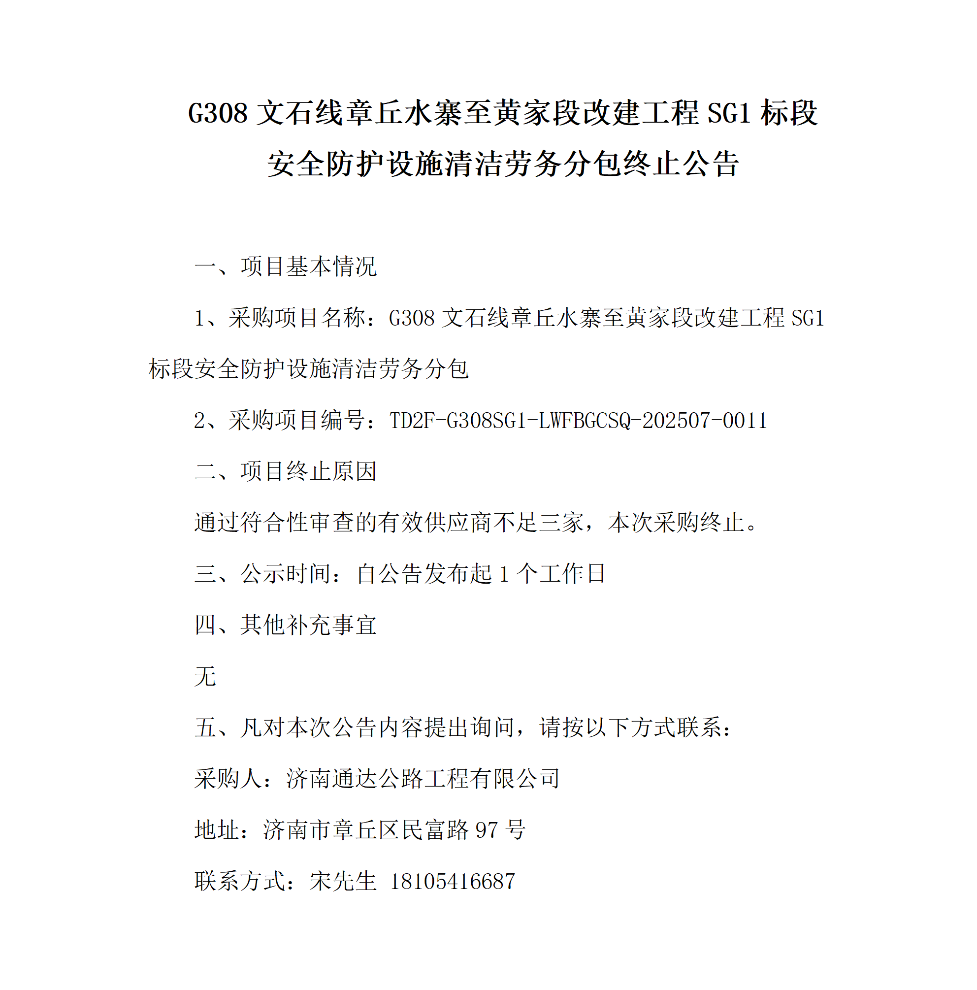 G308文石线章丘水寨至黄家段改建工程SG1标段安全防护设施清洁劳务分包终止公告