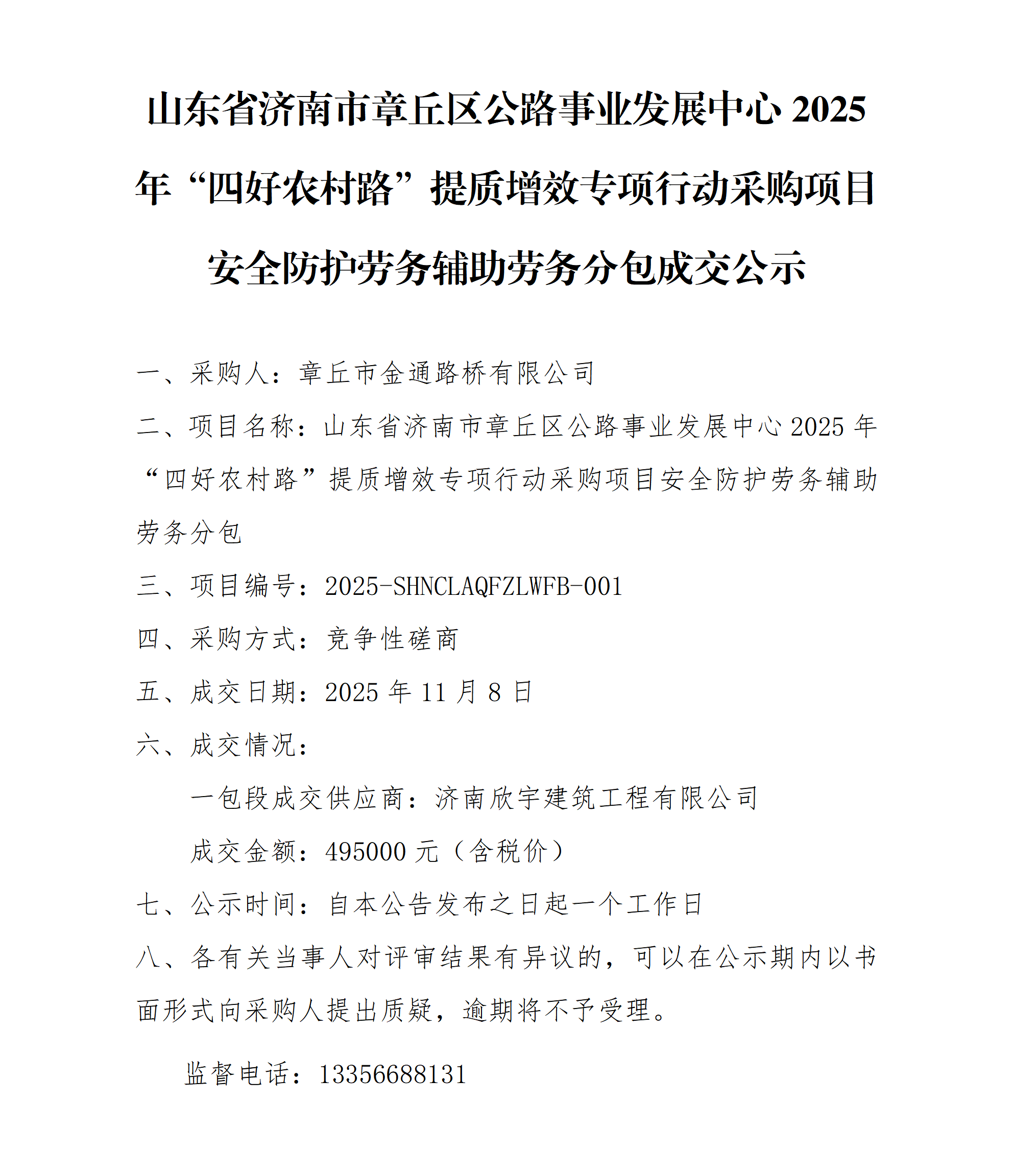 山东省济南市章丘区公路事业发展中心2025年“四好农村路”提质增效专项行动采购项目安全防护劳务辅助劳务分包成交公示