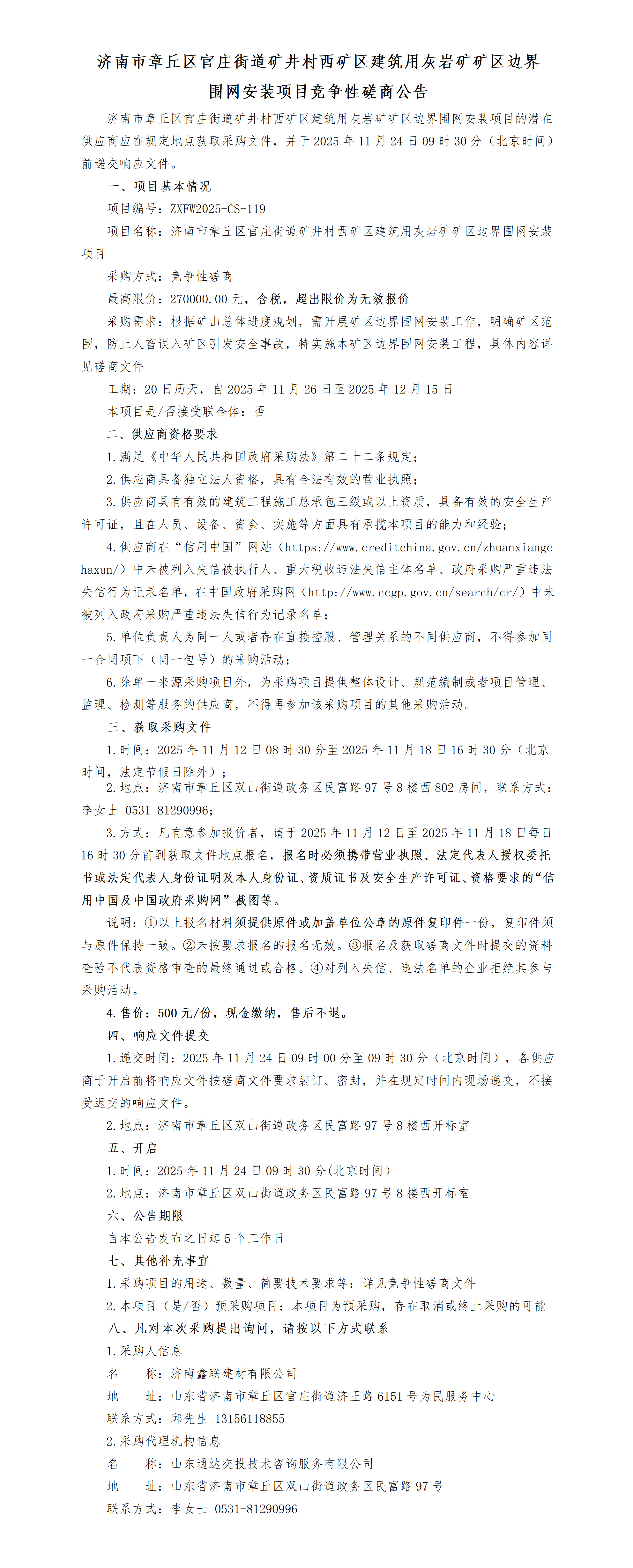 济南市章丘区官庄街道矿井村西矿区建筑用灰岩矿矿区边界围网安装项目竞争性磋商公告