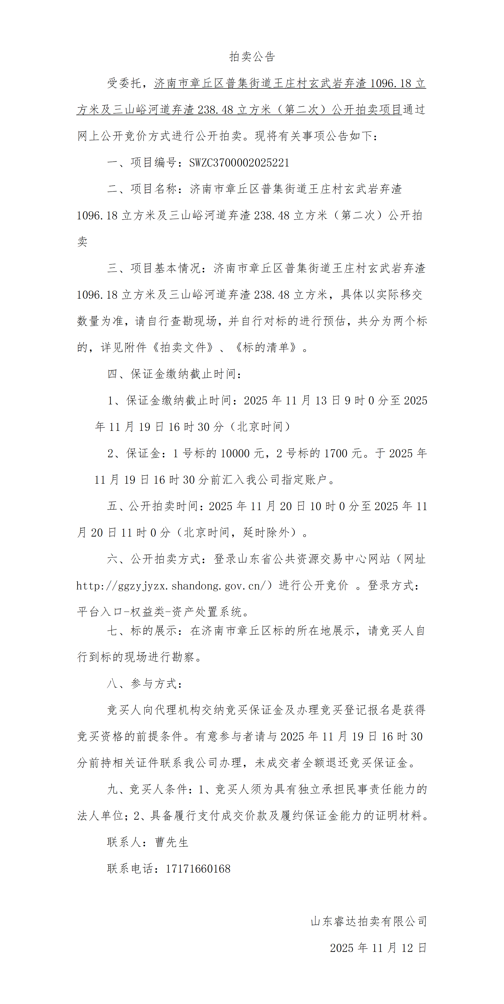 济南市章丘区普集街道王庄村玄武岩弃渣及三山峪河道弃渣处置项目(第二次)拍卖公告