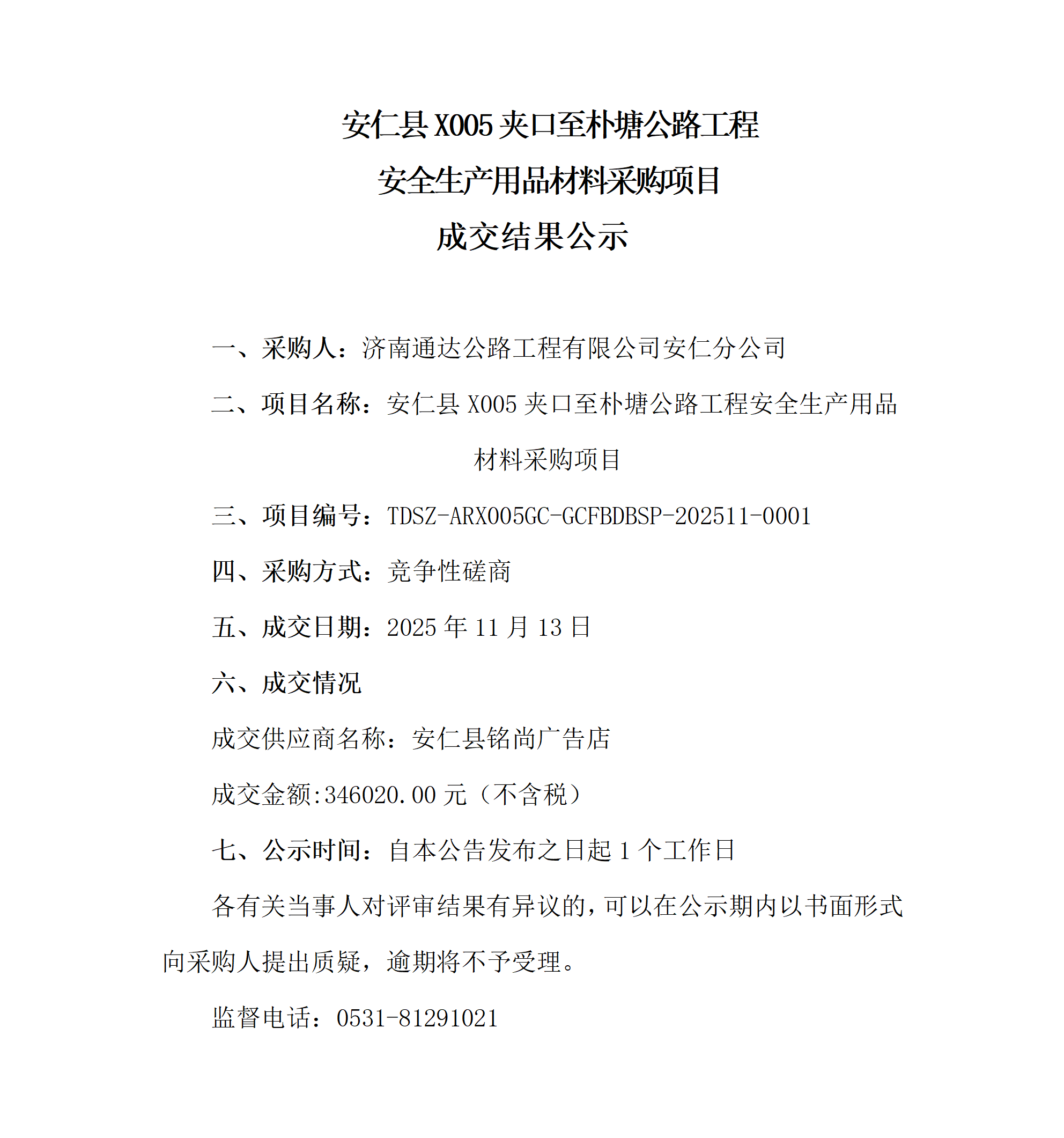 安仁县X005夹口至朴塘公路工程安全生产用品材料采购项目成交结果公示