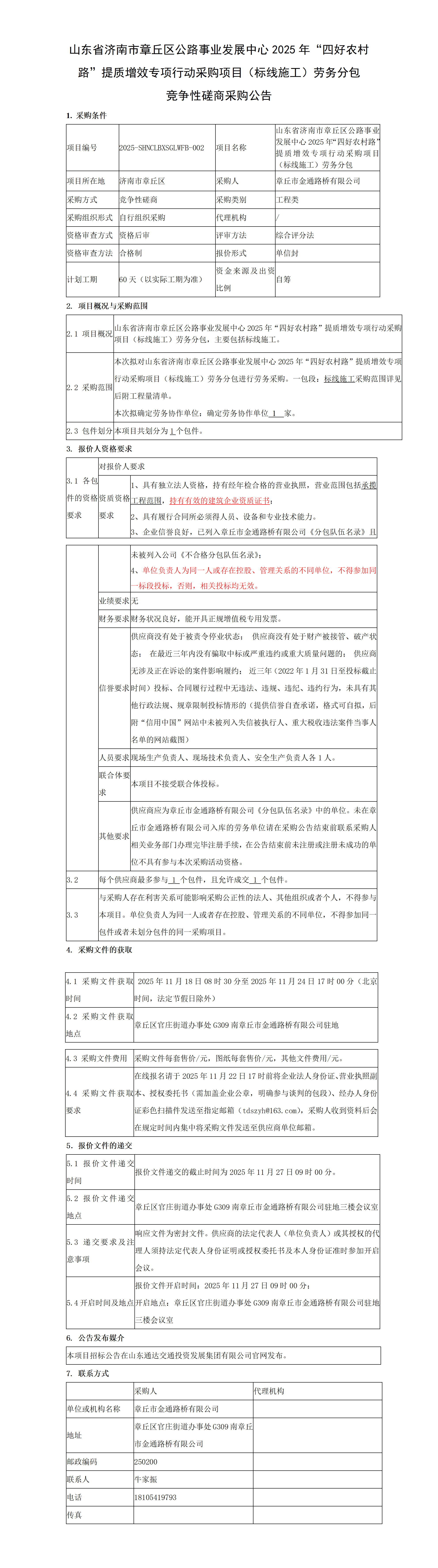 山东省济南市章丘区公路事业发展中心2025年“四好农村路”提质增效专项行动采购项目(标线施工)劳务分包竞争性磋商采购公告