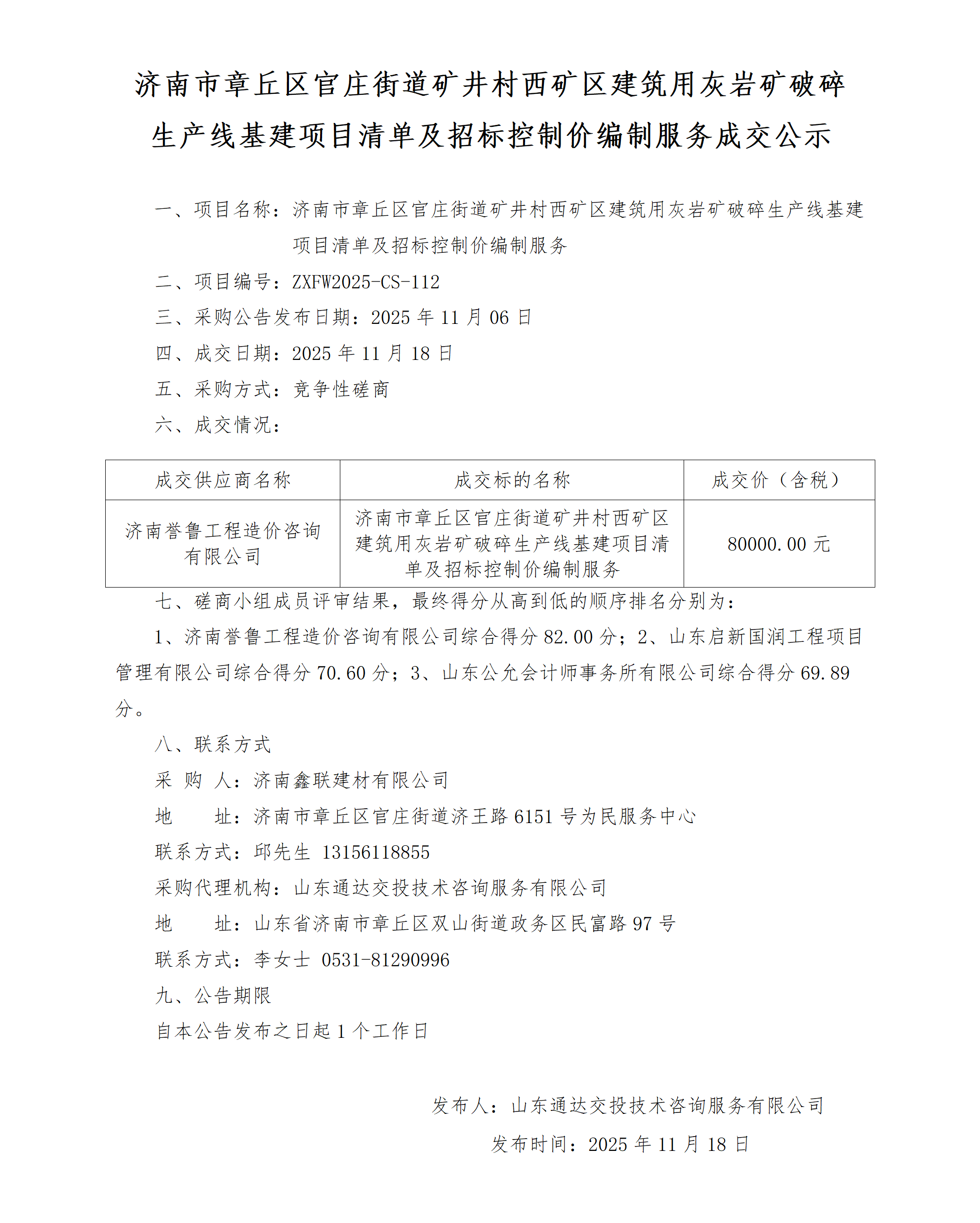 济南市章丘区官庄街道矿井村西矿区建筑用灰岩矿破碎生产线基建项目清单及招标控制价编制服务成交公示