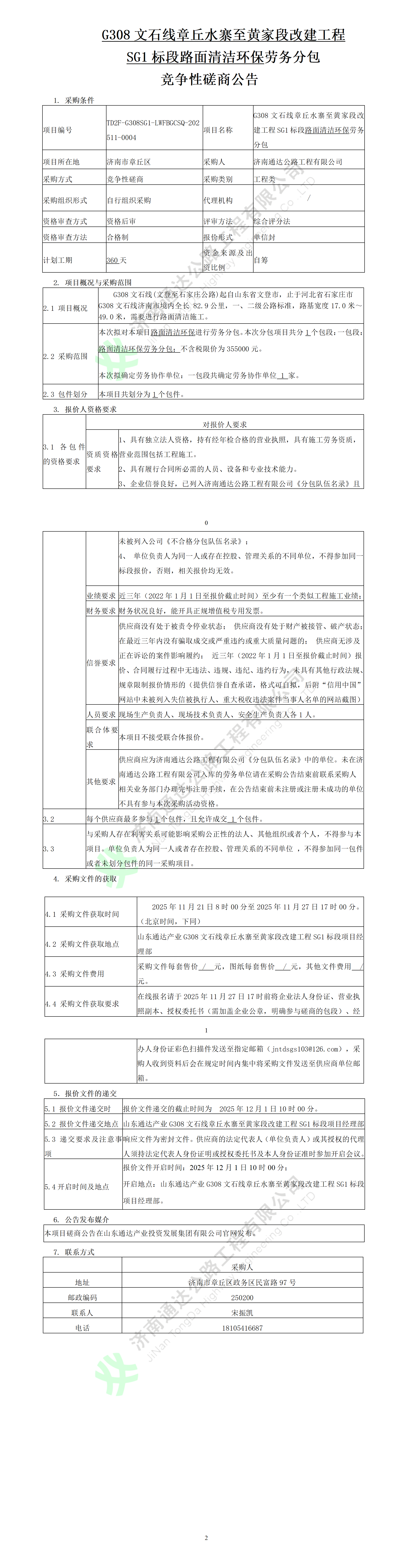 G308文石线章丘水寨至黄家段改建工程SG1标段路面清洁环保劳务分包竞争性磋商公告