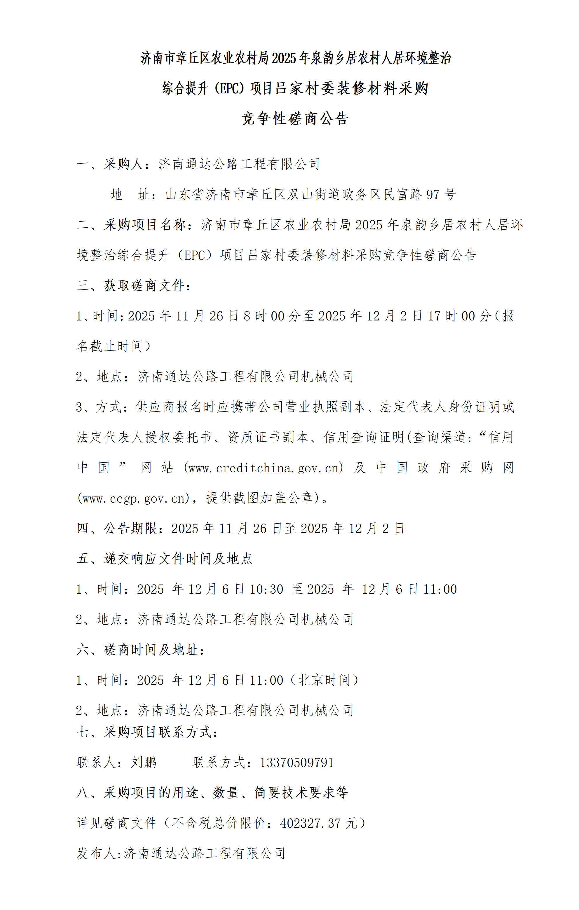 济南市章丘区农业农村局2025年泉韵乡居农村人居环境整治综合提升(EPC)项目吕家村委装修材料采购竞争性磋商公告