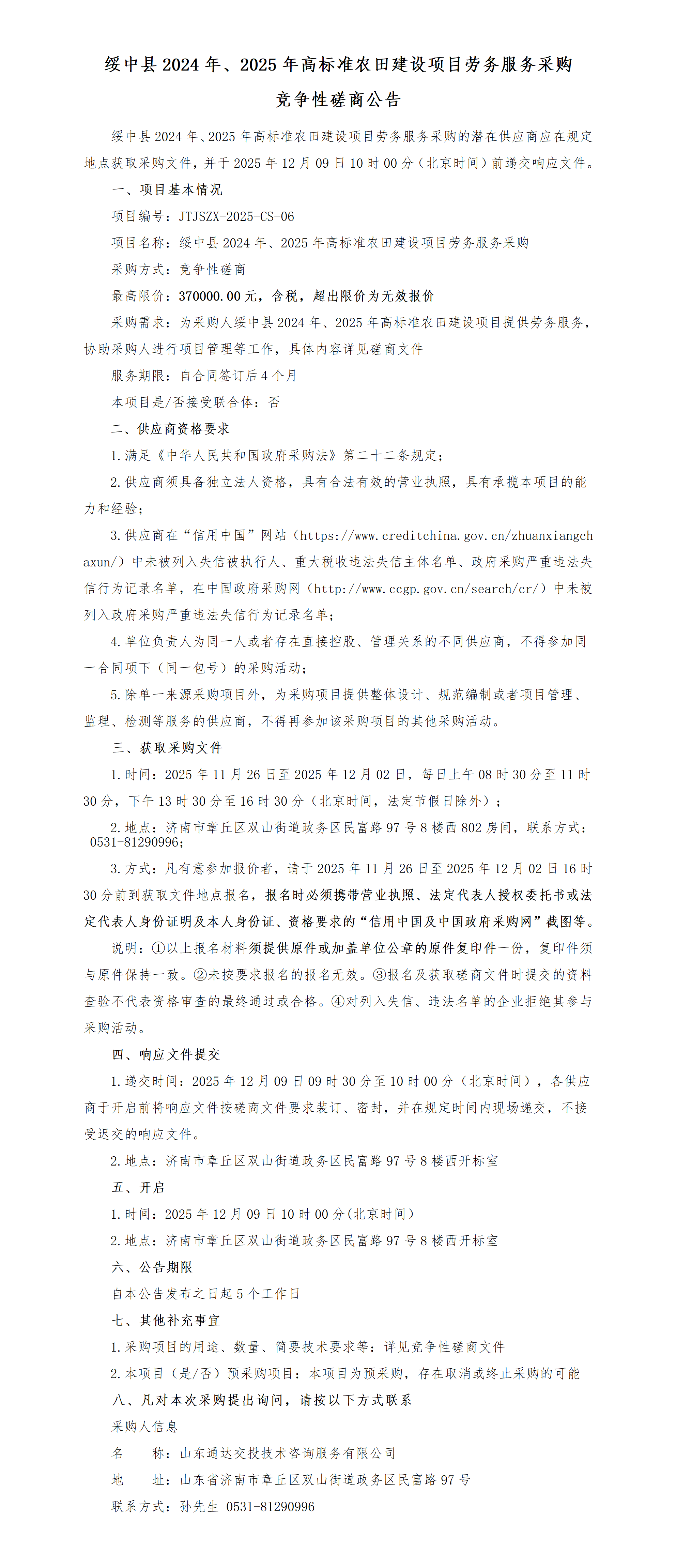绥中县2024年、2025年高标准农田建设项目劳务服务采购竞争性磋商公告