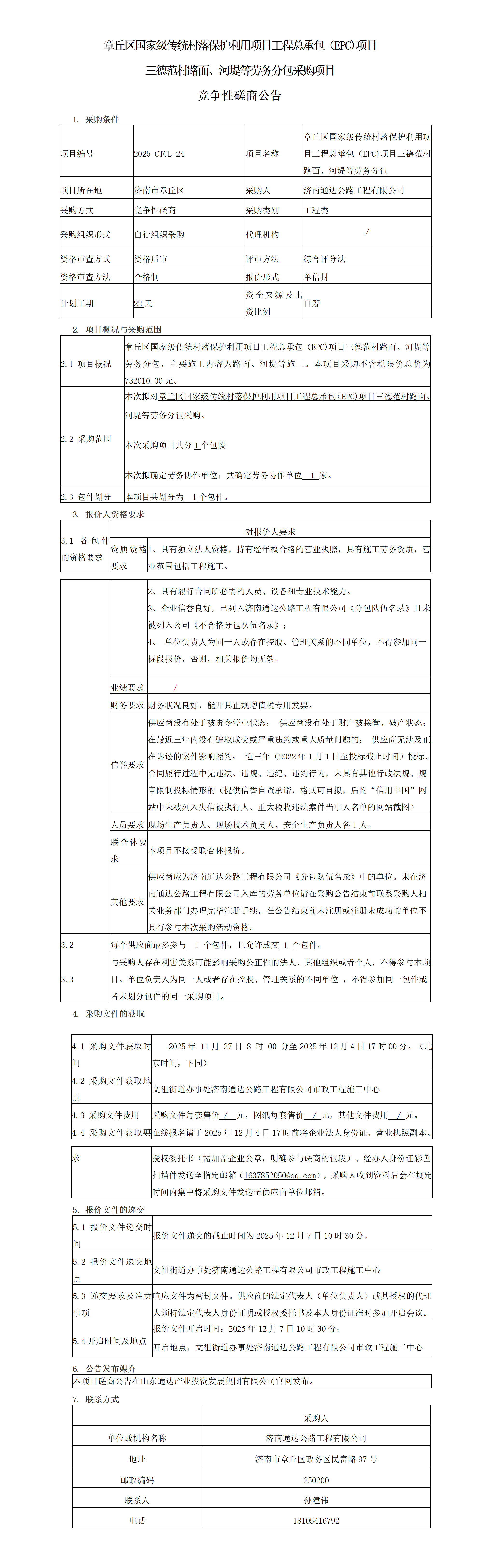 章丘区国家级传统村落保护利用项目工程总承包(EPC)项目三德范村路面、河堤等劳务分包采购项目竞争性磋商公告
