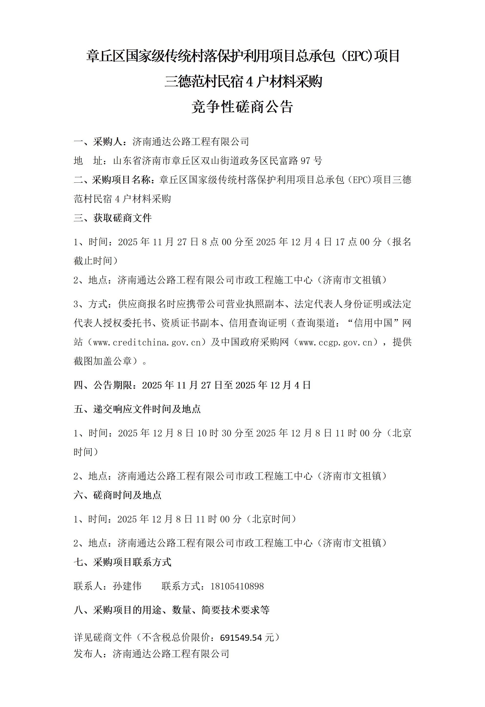 章丘区国家级传统村落保护利用项目总承包(EPC)项目三德范村民宿4户材料采购竞争性磋商公告
