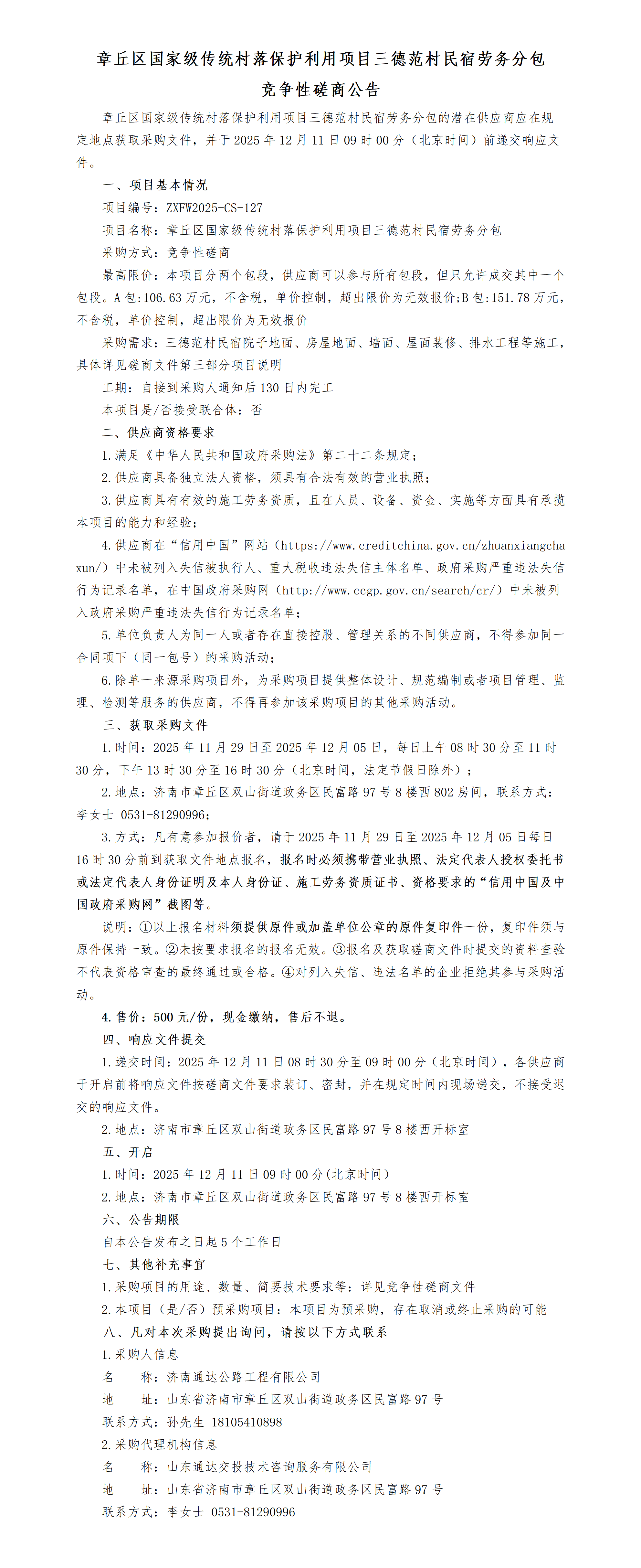 章丘区国家级传统村落保护利用项目三德范村民宿劳务分包竞争性磋商公告
