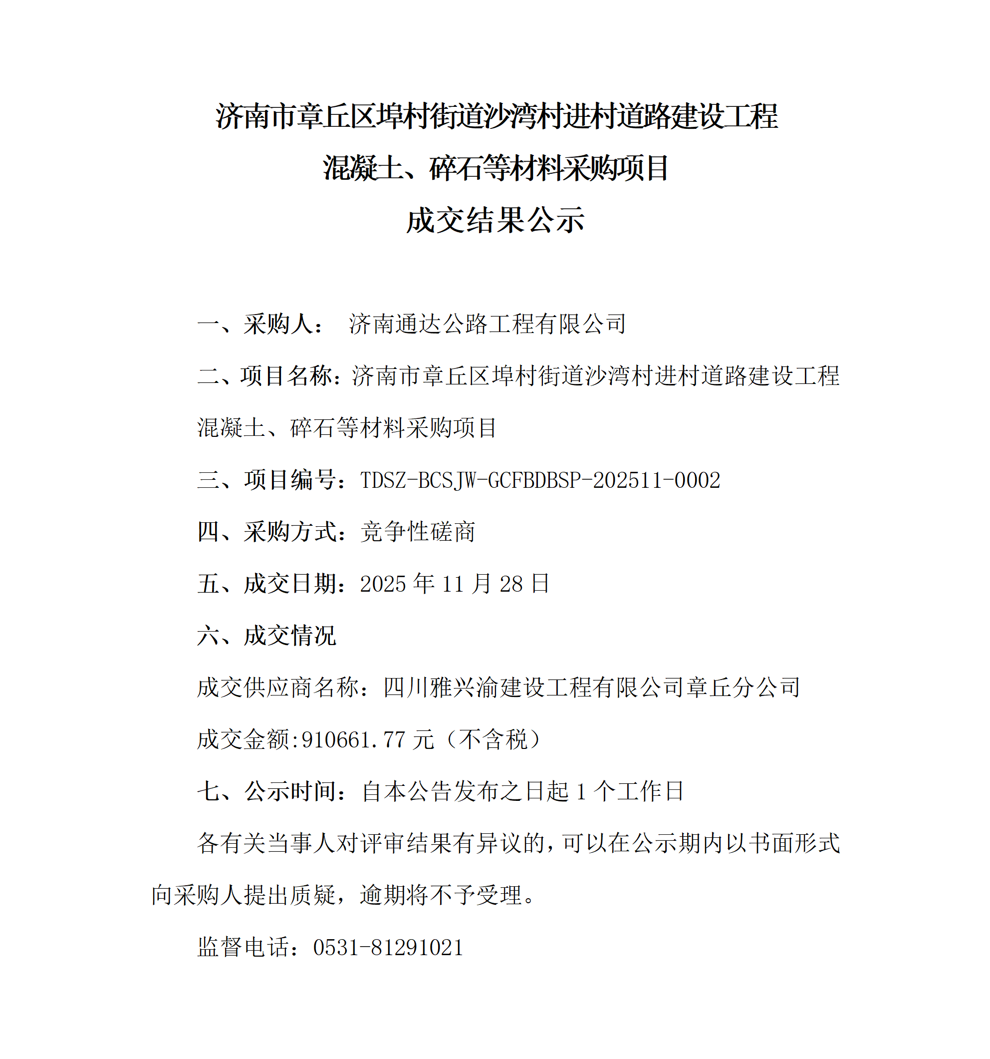 济南市章丘区埠村街道沙湾村进村道路建设工程混凝土、碎石等材料采购项目成交结果公示