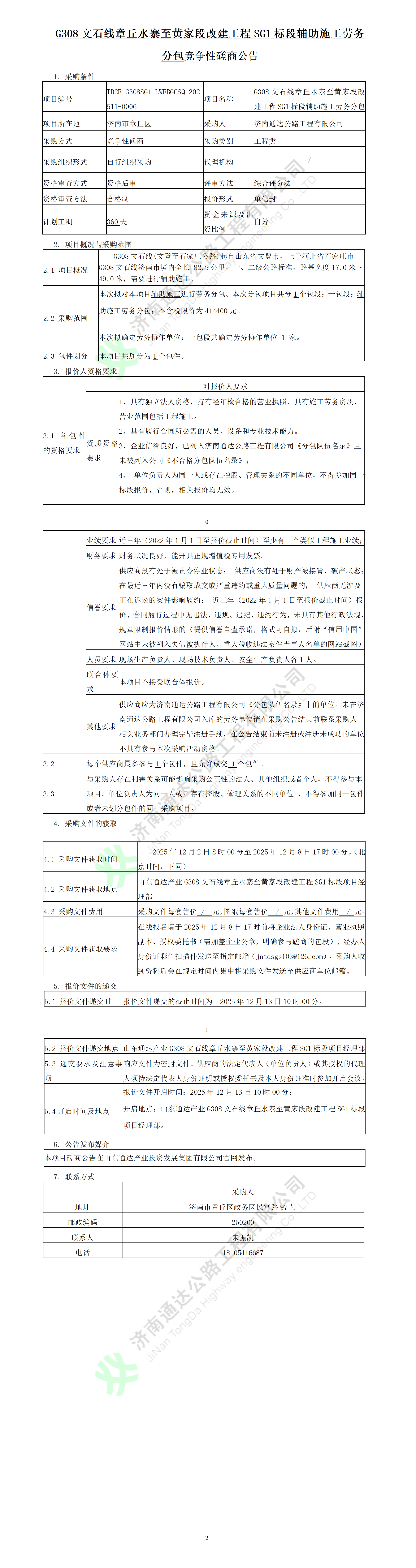 G308文石线章丘水寨至黄家段改建工程SG1标段辅助施工劳务分包竞争性磋商公告