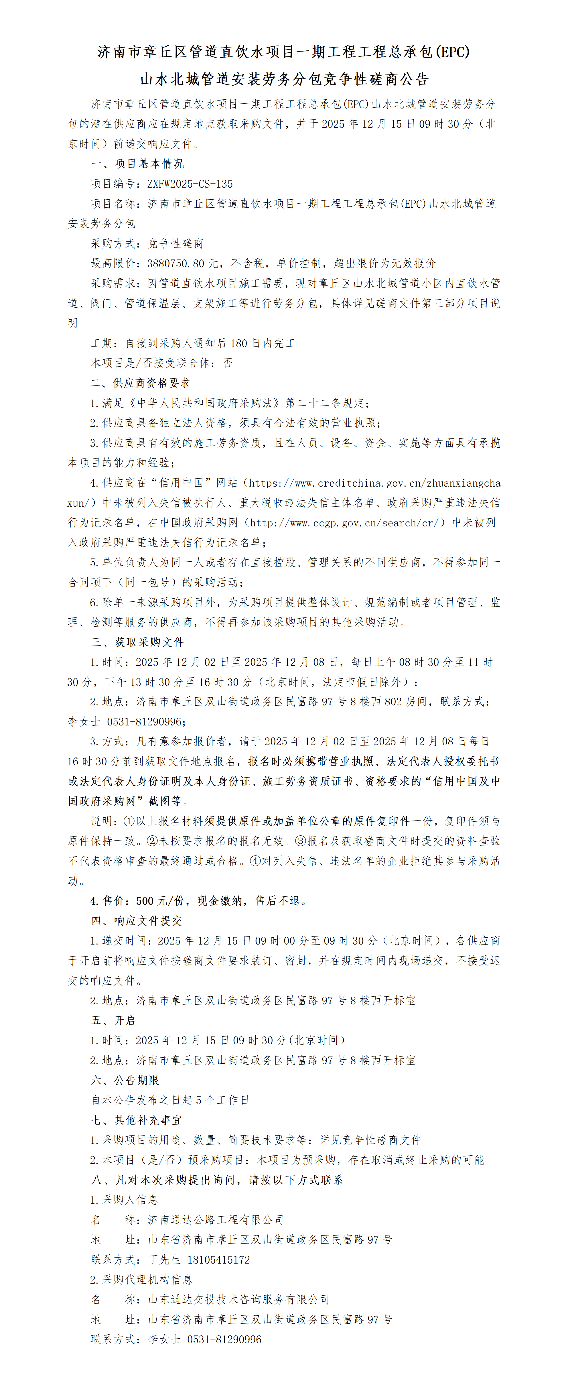 济南市章丘区管道直饮水项目一期工程工程总承包(EPC)山水北城管道安装劳务分包竞争性磋商公告